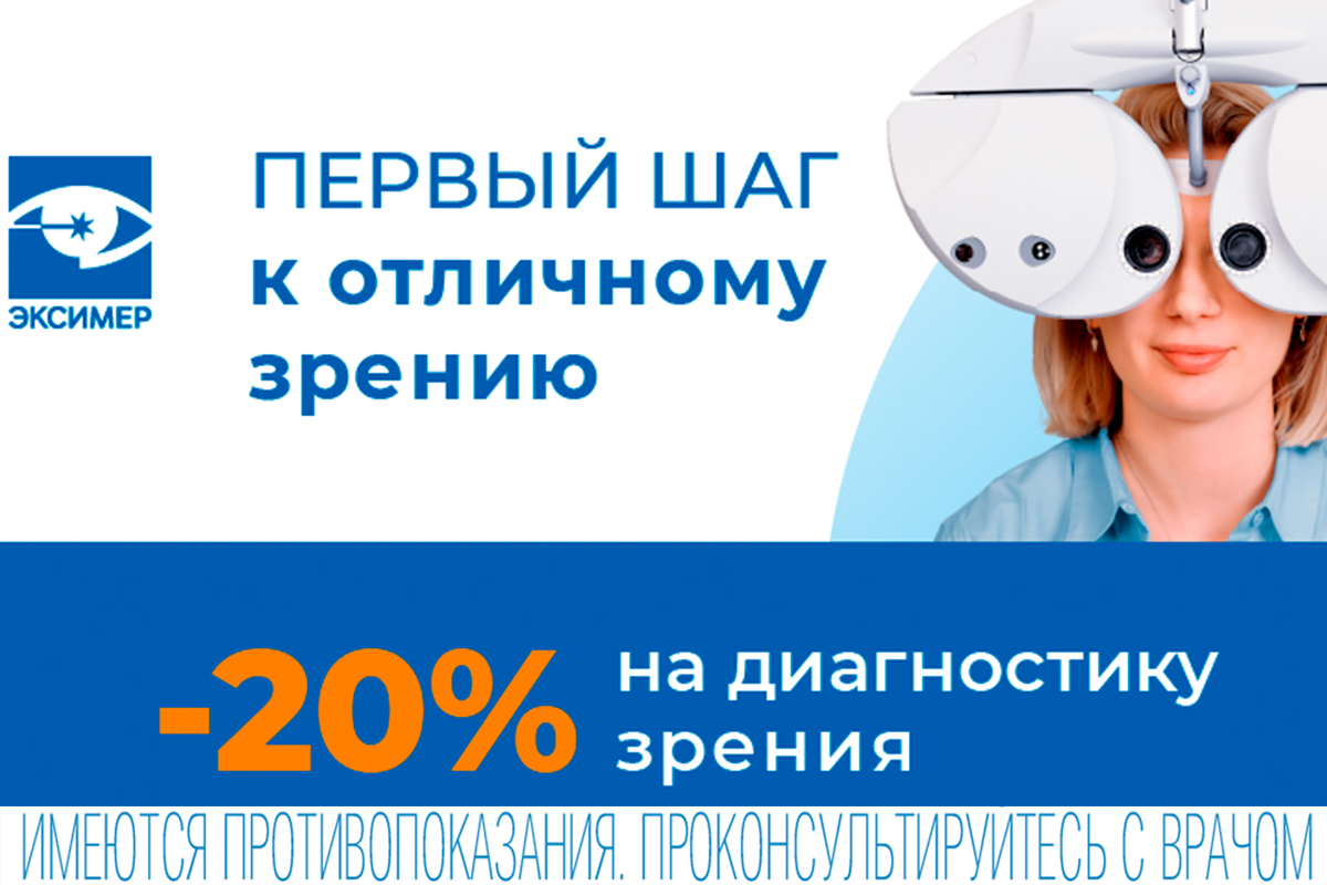 Как сохранить отличное зрение на всю жизнь? Регулярно проходить диагностику зрения в офтальмологической клинике. В январе 2026 года пройдите комплексную диагностику зрения в клинике “Эксимер” в Ростове-на-Дону со скидкой -20%*! Какие ещё плюсы? ● Комплексное обследование проводится по более чем 100 параметрам зрения. ● Высокотехнологичное оборудование нового поколения обеспечивает точность и скорость анализа результатов. ● Консультация врача-офтальмолога включена в стоимость диагностики. ● Возможность выявить заболевания глаз на самой ранней стадии, чтобы предотвратить их развитие. ● Вы получаете полную картину состояния здоровья зрительной системы и рекомендации по лечению при необходимости. Сохраняйте высокое качество зрения для активной жизни! Запишитесь на диагностику зрения в клинику «Эксимер»! *Акция действует с 01 по 28 февраля 2026 г. для лиц старше 18 лет.