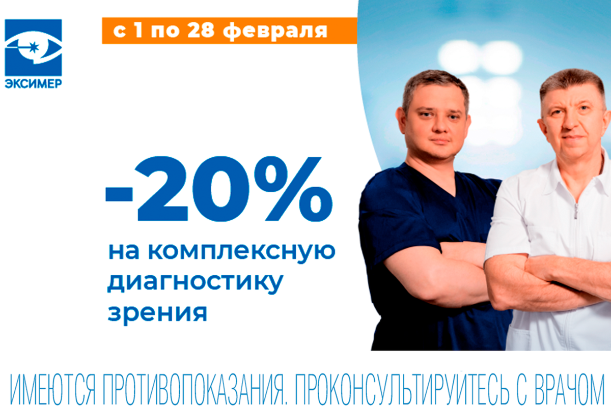 Как сохранить отличное зрение на всю жизнь? Регулярно проходить диагностику зрения в офтальмологической клинике. Весь февраль 2026 года в клинике “Эксимер” действует скидка -20% на комплексную диагностику зрения*. Смотрите, много плюсов! ● Комплексное обследование по более чем 100 параметрам зрения. ● Высокотехнологичное оборудование нового поколения обеспечивает точность и скорость анализа результатов. ● Консультация врача-офтальмолога включена в стоимость диагностики. ● Возможность выявить заболевания глаз на самой ранней стадии, чтобы предотвратить их развитие. ● Вы получаете полную картину состояния здоровья зрительной системы и рекомендации по лечению при необходимости. Сохраняйте высокое качество зрения для активной жизни! Запишитесь на диагностику зрения в клинику «Эксимер»! *Акция действует с 01.02 по 28.02.2026 г. для лиц старше 18 лет, в клинике по адресу: Коломяжский пр., д. 15, к. 2, ул.Типанова, д. 4.