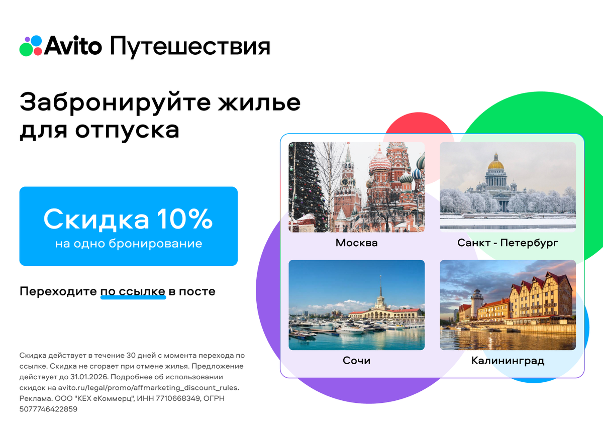 На Авито Путешествиях отличный выбор квартир, домов и апартаментов для краткосрочной аренды. А удобные фильтры помогут найти тот самый вариант. Забронируйте сейчас по ссылке https://avito.prfl.me/profitable_promo_codes/djnu5y?erid=2VtzqvH8vF5 и получите: 🔻 скидку 10% на одно бронирование. Спешите насладиться комфортом по выгодной цене у проверенных арендодателей. Реклама. ООО "КЕХ еКоммерц", ИНН 7710668349, ОГРН 5077746422859 erid: 2VtzqvH8vF5
