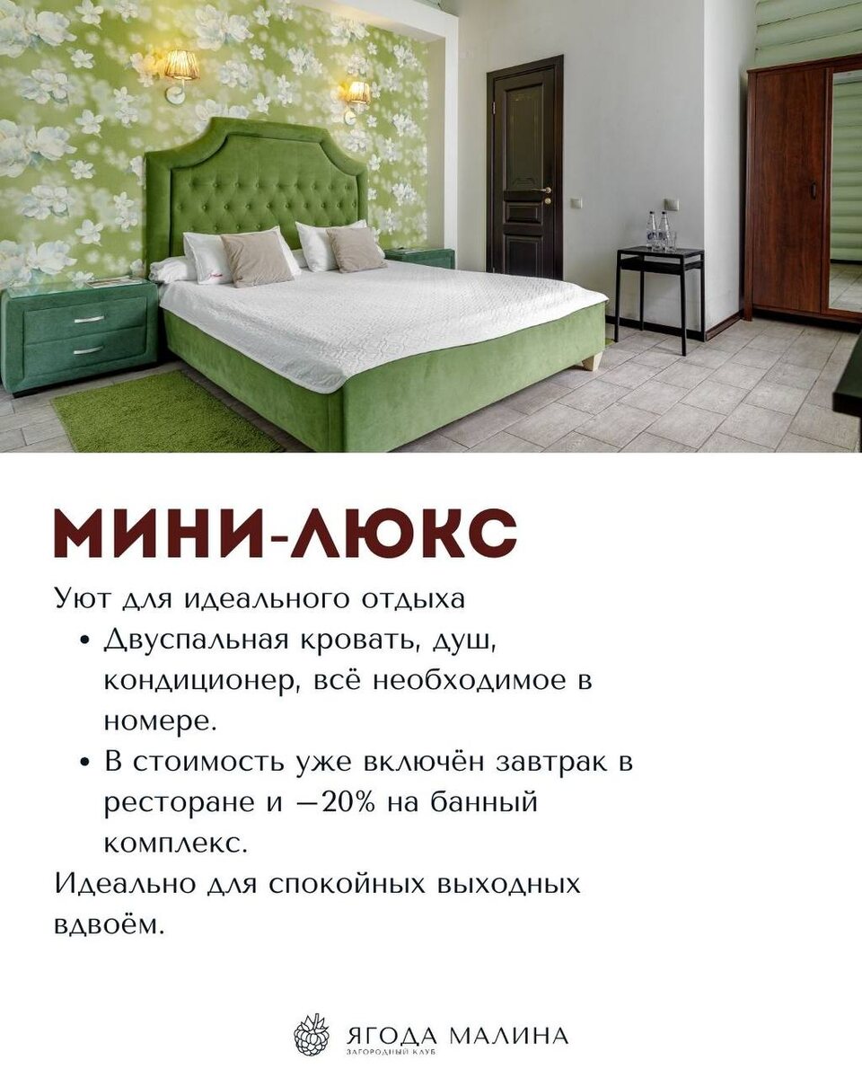 ? В Загородном клубе «Ягода Малина» мы подготовили несколько вариантов проживания — от уютных номеров до просторных коттеджей для компаний и мероприятий Здесь вы найдёте формат отдыха именно для себя: • романтические выходные вдвоём • семейный уикенд на природе • праздник с друзьями или закрытое мероприятие Во всех вариантах проживания вас ждут комфорт, завтрак в ресторане и приятные бонусы — скидка 20% на банный комплекс Выбирайте свой идеальный номер или коттедж и бронируйте отдых уже сейчас 💚 📲 Подробности и бронирование — в директ / по телефону: +7 (938) 551-00-07
