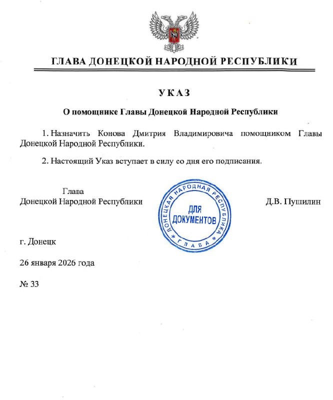 Пушилин назначил Конова Дмитрия Владимировича помощником Главы ДНР