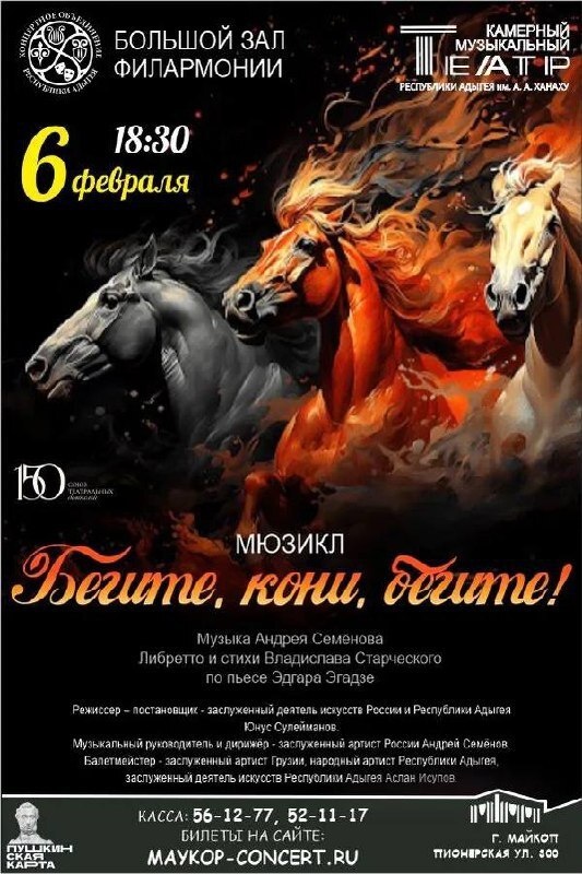 А.А. Ханаху представит премьеру мюзикла «Бегите, кони, бегите» 6 февраля в 18:30 в Филармонии КОРА Камерный музыкальный театр Республики Адыгея им. А.А. Ханаху представит премьерный мюзикл «Бегите, кони, бегите». Через историю главного героя, Алана, который, выйдя из тюрьмы, стремится к власти и авторитету. Рядом с ним всегда хитрый Шэдоу, который дает ему силу управлять людьми, вселяет уверенность и позволяет чувствовать себя значимым, сильным, особенным. Его жажда власти приводит к тому, что Алан теряет самые важные вещи - семью и любовь. ⚫️Режиссер-постановщик - заслуженный деятель искусств России и Республики Адыгея Юнус Сулейманов. ⚫️Музыкальный руководитель и дирижер - заслуженный артист России Андрей Семенов. 💬Минкульт Адыгеи в МАХ