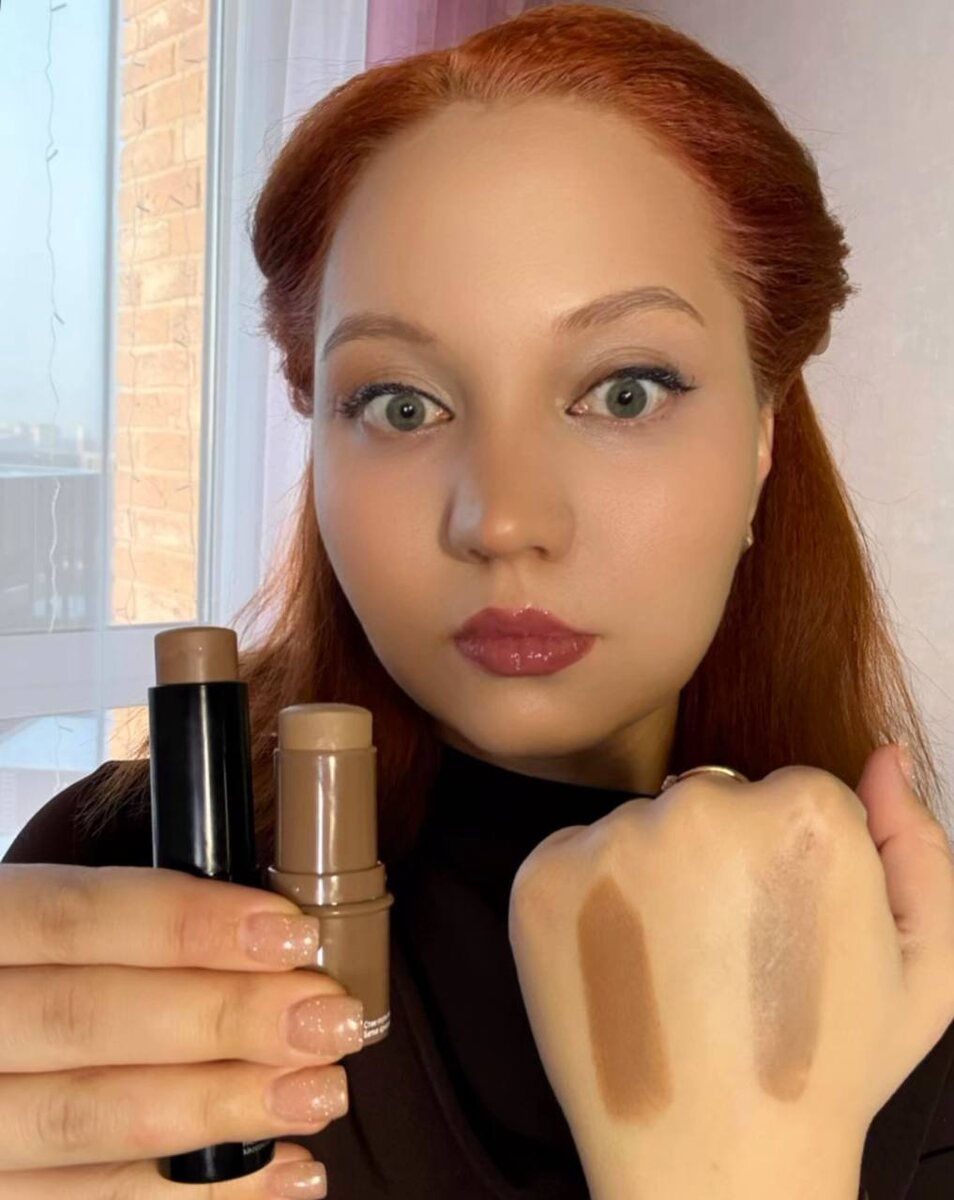 ) Посмотрите, какой он рыже -коричневый! Для сравнения взяла бюджетный скульптор от Belor Design и тоже нанесла на руку, чтобы заметна была difference 🔪 Разница на лицо и на лице! Присмотритесь, видно, где рыжий оттенок, а где серый на скуле. У Кико это скорее бронзер, при этом он даже не попадает в цвет загара у светлых девушек… а вот у Belor классический цвет тени на лице Так что не тратьтесь зря, берите стик от Белор и будет вам счастье🕊