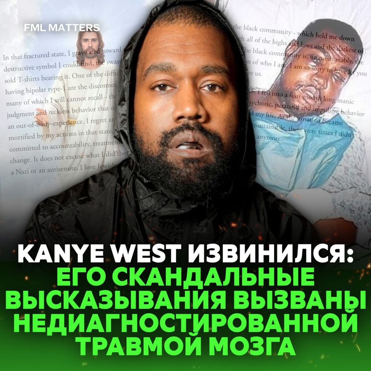 ! Йе опубликовал развёрнутое заявление с извинениями за свои антисемитские высказывания, объяснив их недиагностированной травмой мозга от аварии 2002 года, которая привела к биполярному расстройству. Травму выявили только в 2023 году. «Двадцать пять лет назад я попал в автомобильную аварию... Более глубокая травма внутри черепа осталась незамеченной. Корректно это диагностировали только в 2023 году» Биполярное расстройство I типа во время маниакальных эпизодов заставляет человека полностью терять связь с реальностью, при этом убеждая его в собственной правоте и ясновидении. «Биполярное расстройство имеет собственный механизм защиты — отрицание... Ты думаешь, что видишь мир яснее, чем когда-либо, тогда как на самом деле теряешь с ним связь» Йе берёт на себя полную ответственность за самые шокирующие действия — использование нацистской символики и связанные с этим заявления. «В этом состоянии я потянулся к самому разрушительному символу, который смог найти, — свастике... Я сожалею