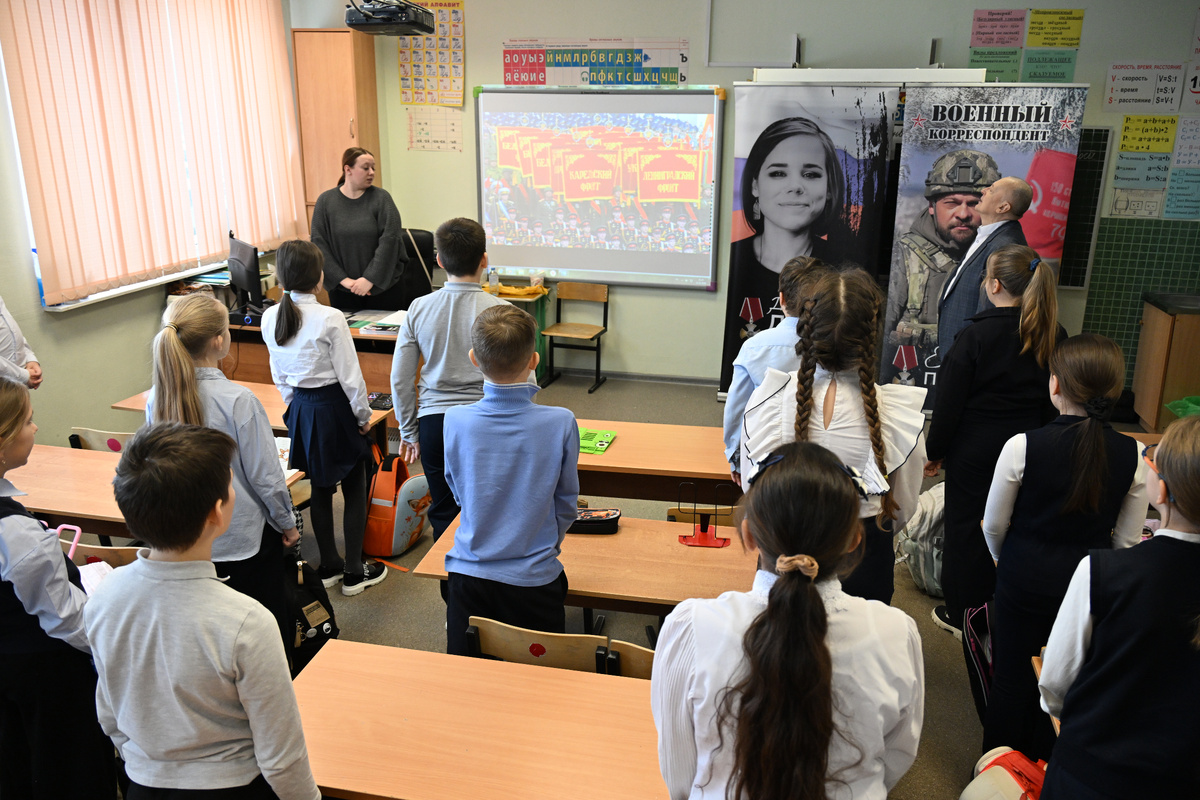 Асаковская школа. После общения со старшеклассниками идем к младшим. И делаем один из лучших «Уроков Мужества. Военкоры» Удивительные дети! Просто замечательный 4 «А» класс! Как мы спели Гимн! Просто образцовое исполнение! На любом конкурсе сразу же получили высший балл! Серьезно! Великие полководцы России, высшие награды Родины, имена военкоров, в чем