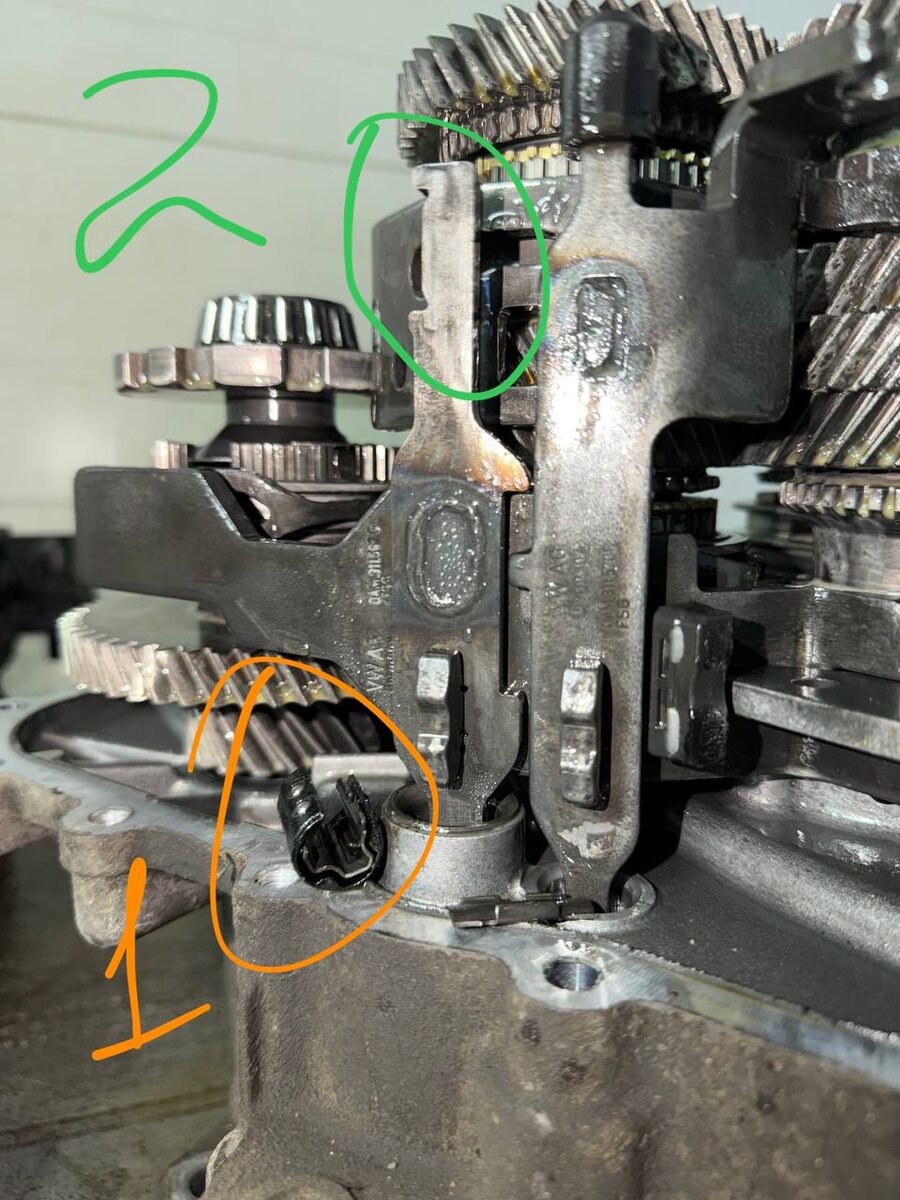 Друзья, а вот наглядный пример того, как ломается скользящий подшипник (1) на вилке задней/шестой передачи (2