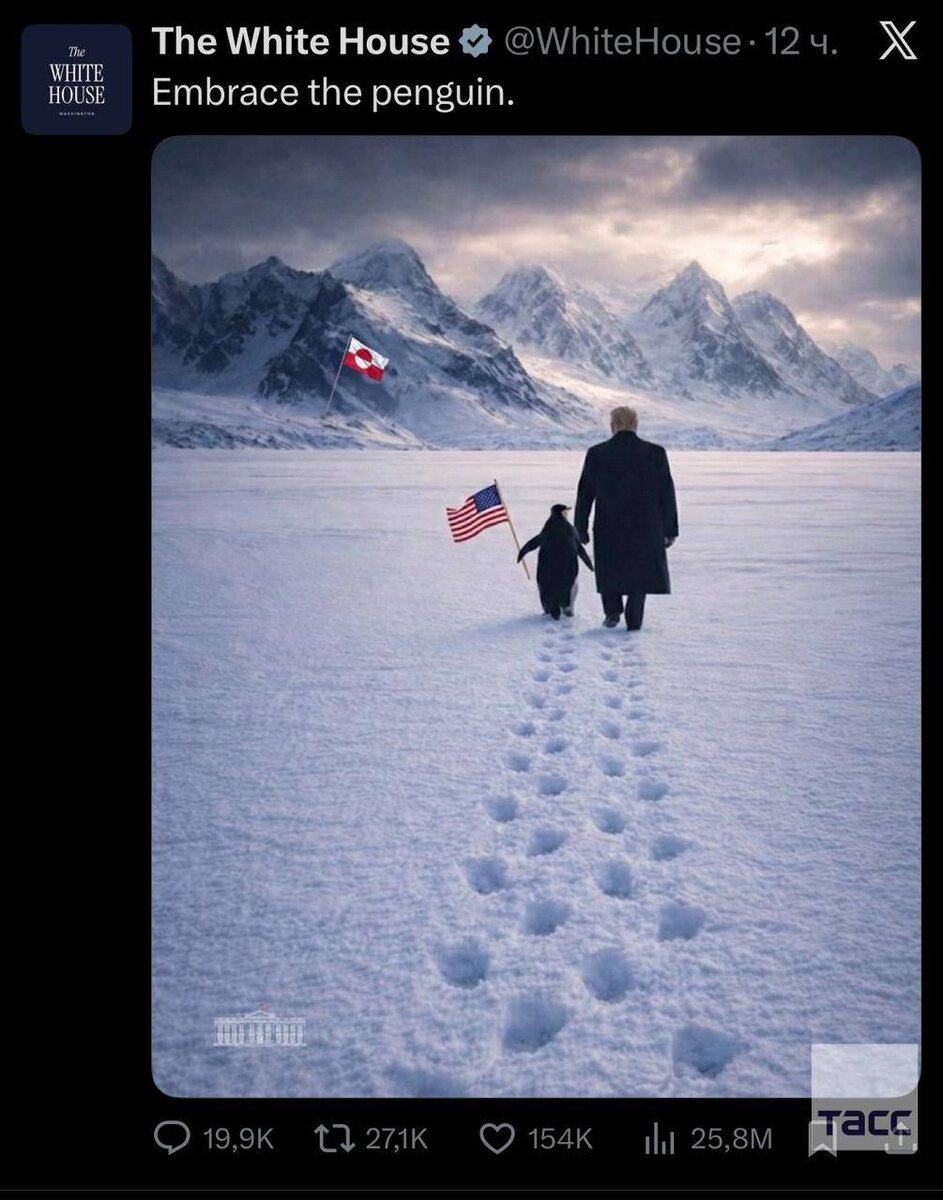 Следите за руками: 1️⃣24 января Белый дом постит ИИ-картинку с Трампом, который за ручку гуляет с пингвином по Гренландии. Подпись к фото гласит «Embrace the penguin». Это игра слов. Фраза одновременно отсылает к старой рекламе Linux (их символом был пингвин). Дословно она означает«обнимите пингвина», но ее переносный смысл — «примите себя». 2️⃣Комментаторы тут же смеются над Трампом, потому что в Гренландии нет пингвинов. Но это не важно. Ведь параллельно по соц сетям с бешеными скоростями разгоняют вирусняк про одинокого пингвина, который в 2007 году отбился от стаи в Антарктиде. В рилзах его называют «пингвином-нигилистом», который рискует и завоевывает новые вершины, несмотря на мнение толпы. По аналогии с президентом США, который внезапно решил присоединить к стране полмира. Плюс, статьи про мем появляются в мусорных СМИ типа The Times of India, которые часто используют республиканцы. Также к тренду начали подключаться некоторые бренды, например, Duolingo. 3️⃣ При этом интернет