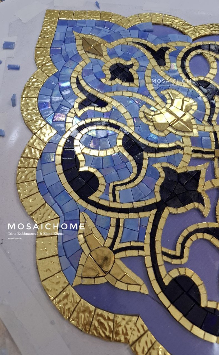Орнаменты в восточном стиле из стеклянной мозаики Для обрамления мы использовали мозаику настоящее формованное золото, для рисунка мозаику с сусальным золотом российского производства. Эти материалы позволяют использовать панно в хаммаме и даже на дне бассейна без опасений, что мозаика не выдержит высоких температур и постоянного присутствия пара и воды