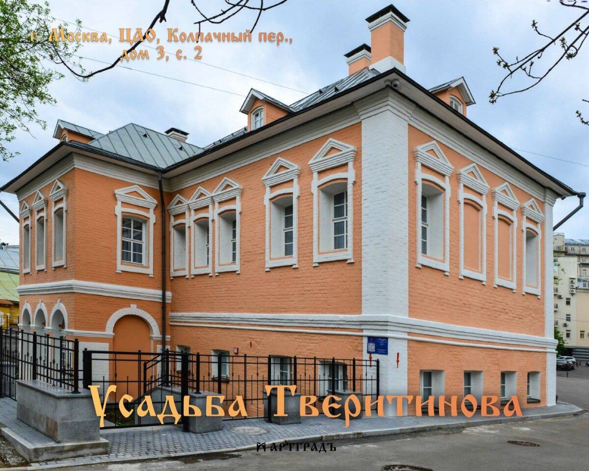Архитектурный стиль: Барокко, Древнерусское зодчество, Эклектика, Узорочье Эпоха: 18 век Небольшие каменные палаты в Колпачном переулке были построены в начале XVIII века подьячим Сытного приказа А. Онучиным (Анучиным). Уже в 1711 году он продал усадьбу врачу главной московской аптеки Дмитрию Тверитинову. Тверитинов вошёл в историю как «еретик»: бывший стрелец, он изучал медицину в Немецкой слободе, где увлёкся протестантизмом. На его основе он разработал собственное учение, отрицавшее многие церковные обряды, и активно привлекал последователей. За это его предали анафеме и заключили в монастырь, откуда в 1718 году он был освобождён по поручительству, во многом благодаря заступничеству Петра I, знавшего Тверитинова. В 1723 году он получил полное прощение. 🔸Этапы перестройки и реставрации При Тверитинове дом был перестроен, возможно, по проекту его единомышленника, каменщика Каменного приказа М. Косого. От этого периода сохранился первый этаж правой части в стиле барокко с пятью жил