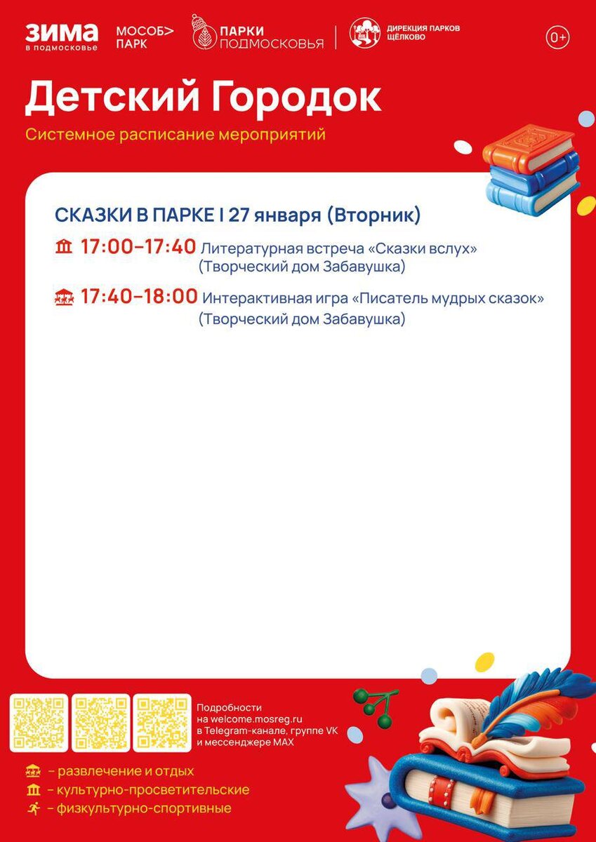 » 🐱 Уже завтра в парке пройдёт литературная программа, посвящённая 200-летию со дня рождения русского писателя М. Е. Салтыкова-Щедрина. Юных гостей и их родителей ждут: 📒 Литературная встреча «Сказки вслух»: чтение и обсуждение сказок в доступном и увлекательном формате. 📒 Интерактивная игра «Писатель мудрых сказок»: знакомство с творчеством автора и проверка знаний в игровой форме. 📍 27 января в 17:00. #зимавподмосковье #культуращёлково