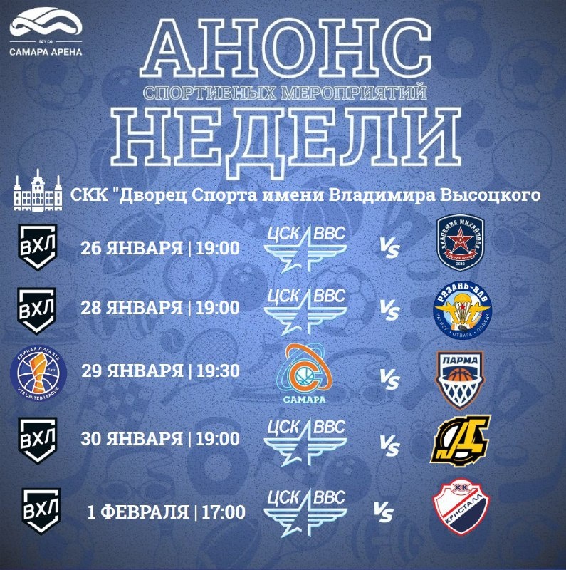 Поддержите самарских спортсменов на серии домашних матчей по хоккею и баскетболу в центре города. На льду и паркете сойдутся лучшие команды в борьбе за победы в рамках чемпионатов и Единой лиги ВТБ. 📅 26 января – 1 февраля 📍 Дворец Спорта имени Владимира Высоцкого, ул. Молодогвардейская, 222 Подробная афиша #активныйотдых #навыходных 👉 куда ещё сходить в Самаре