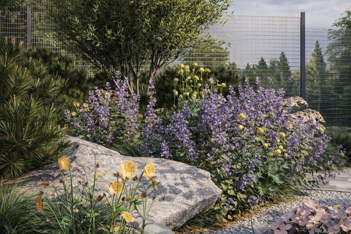 В парадной зоне использовано сочетание котовника и купальницы европейской, создающее выразительную композицию в фиолетово-жёлтой гамме. Купальница зацветает в начале июня и сохраняет декоративность около месяца, после чего основной визуальный акцент на протяжении всего лета берёт на себя котовник. Дополнительно в посадках применён тысячелистник ‘Apricot’, отличающийся продолжительным цветением и постепенной сменой окраски соцветий в течение сезона. В период его цветения рядом зацветает гравилат ‘Mai Tai’, подчёркивая и усиливая тёплые абрикосовые оттенки тысячелистника. В теневом цветнике использованы чистец, аквилегия, осока Морроу, мукдения и ель глаука глобоза. Осенью мукдения приобретает золотисто-оранжевую окраску, эффектно контрастирующую с голубой хвоей глауки глобозы, что придаёт композиции дополнительную глубину и выразительность.