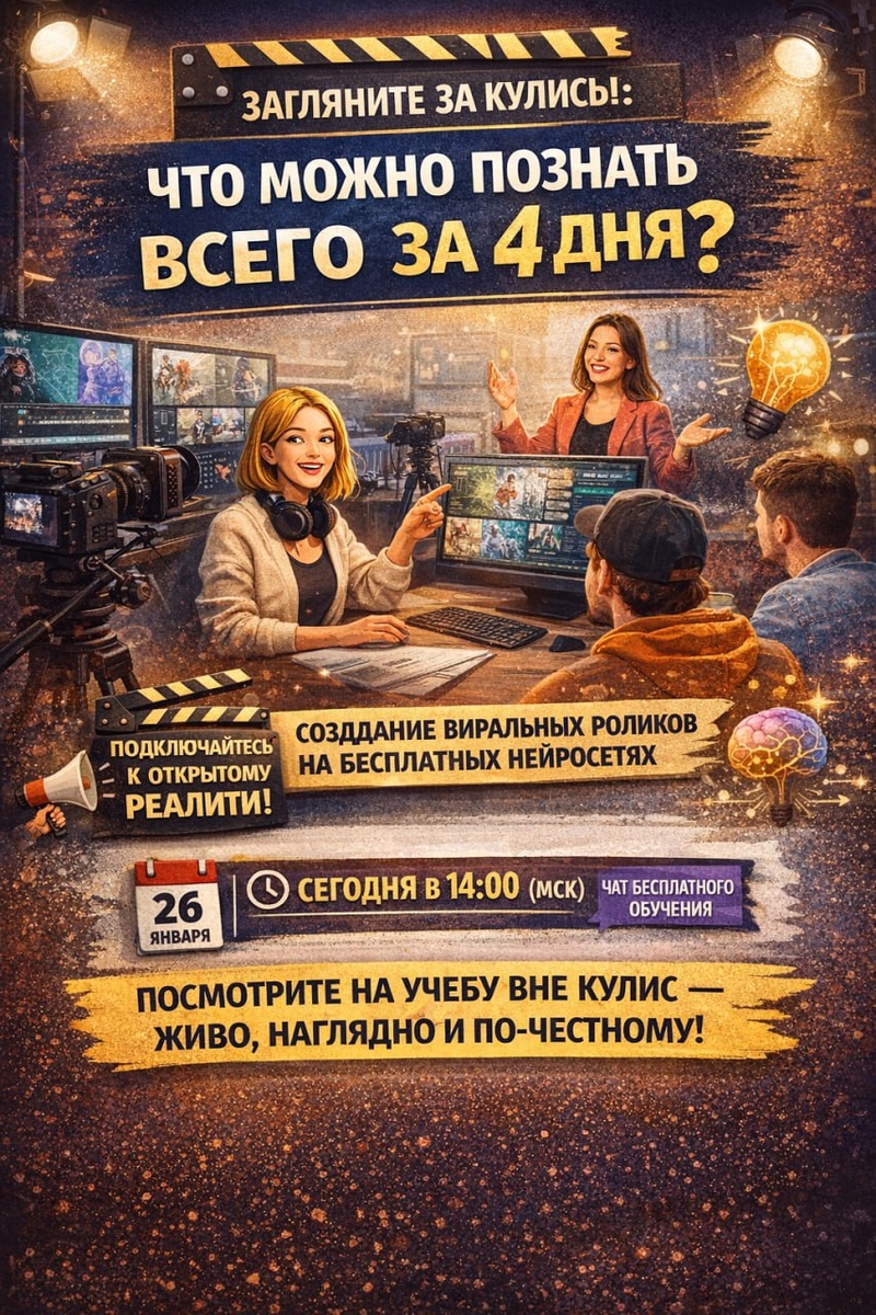 ? Вас когда-нибудь завораживали красивые ролики, и вы думали: «У меня так никогда не получится»? Кажется, что на это уходят месяцы обучения и невероятные ресурсы. А может, всё проще, чем кажется? 26 января, в понедельник, в 14:00 (МСК) приглашаем вас присоединиться к нашему уникальному открытому реалити. Вы сможете заглянуть за кулисы закрытого обучения, которое в данный момент ведёт Ксения Тымчук: «СОЗДАНИЕ ВИРАЛЬНЫХ РОЛИКОВ НА БЕСПЛАТНЫХ НЕЙРОСЕТЯХ». Что вас ждёт на этом реалити? Забудьте о теории — мы покажем и процесс, и результаты: ✨ Изнутри: Узнайте, как проходят занятия, какие задания получают участники, и каким образом обеспечивается обратная связь. ✨ Прямые вопросы: Узнайте у участников, что для них оказалось самым сложным и как они себя чувствуют теперь. Присоединяйтесь, если вы: ❓ Не уверены, что сможете создавать видео. ❓ Размышляете, нужно ли вам такое обучение. 💻 Желаете понять, как проходят наши программы и дают ли они практические навыки. 💡 Ищете способ начат