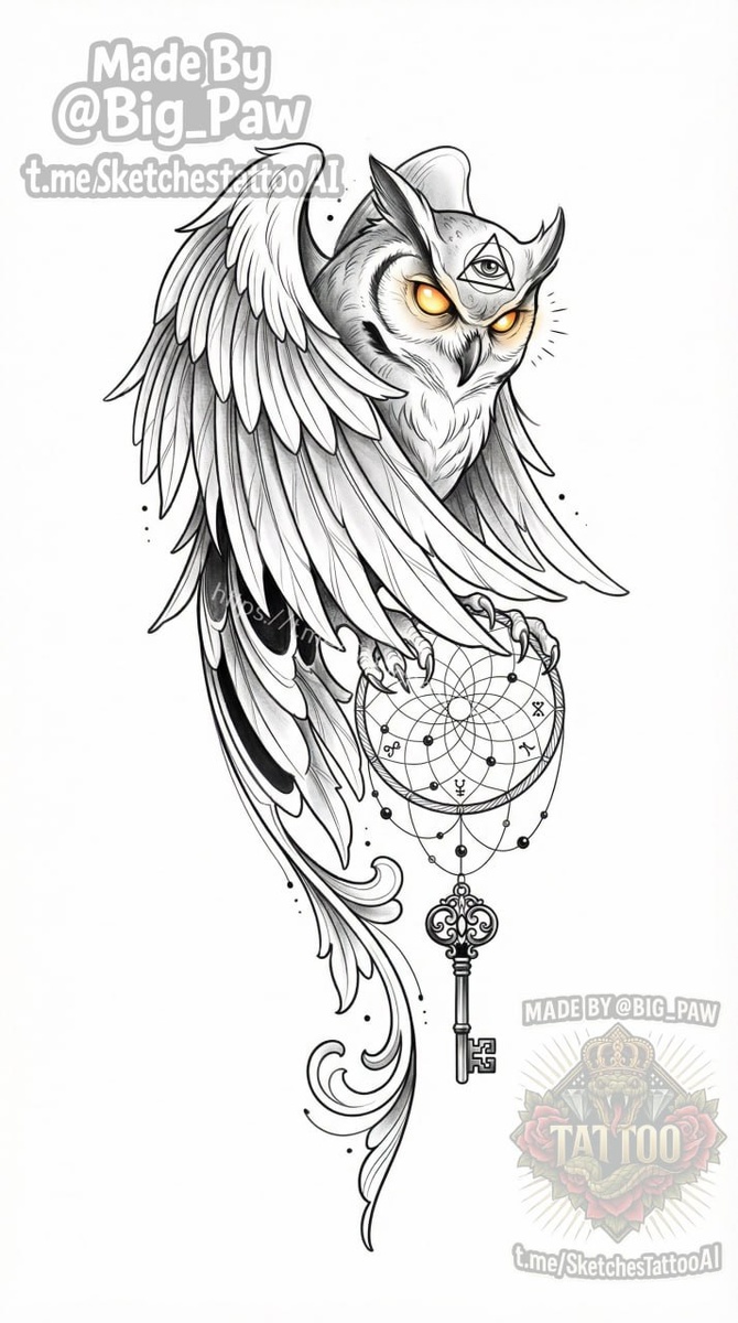 были до запястья, добавить третий глаз в треугольнике и ключ 🧠 SYNTX - тут создан эскиз 💎 Информация - все услуги 💀 Эскизы от нейросети 😎 Удалить тату #филин #ловецснов #чбцвет #эскиз #тату #татуировка