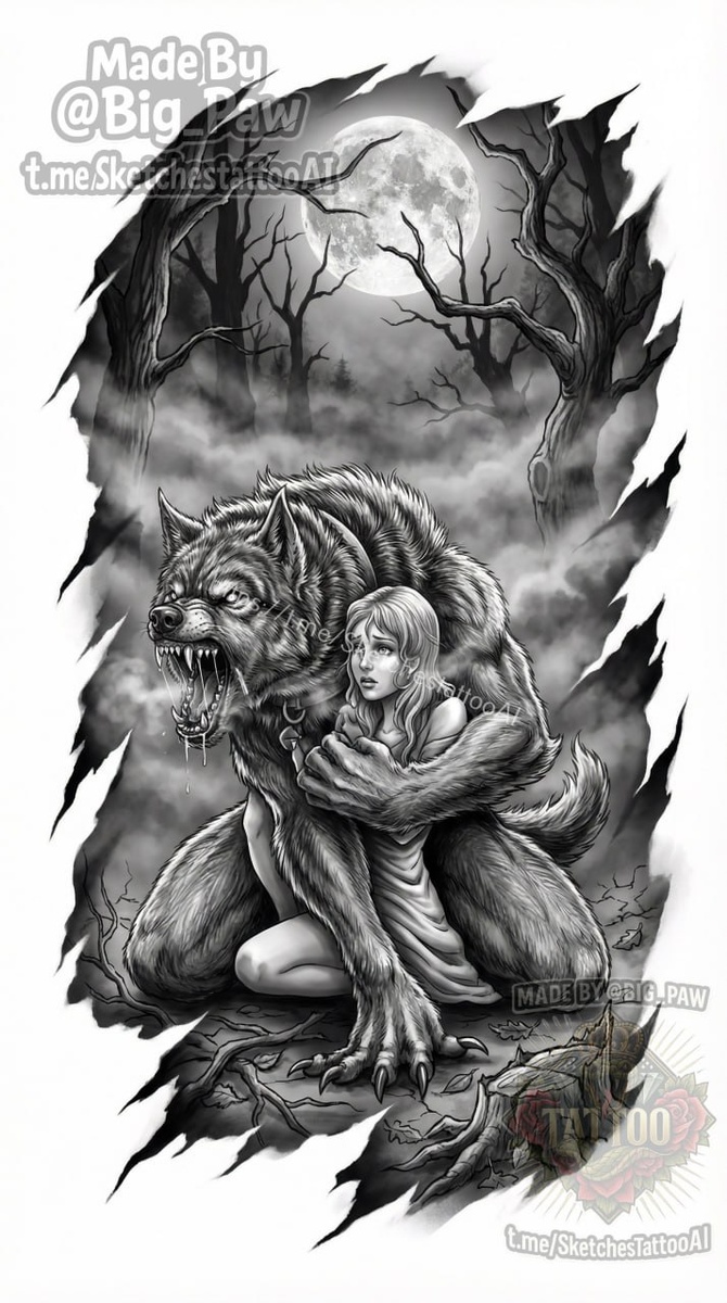 предплечье. 🧠 SYNTX - тут создан эскиз 💎 Информация - все услуги 💀 Эскизы от нейросети 😎 Удалить тату #волк #девушка #оборотень #эскиз #тату #татуировка