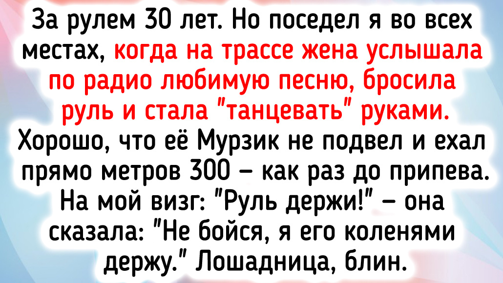 За рулем 30 лет. Но поседел я во всех местах, когда на трассе жена услышала по радио любимую песню, бросила руль и стала "танцевать" руками. Хорошо, что её Мурзик не подвел и ехал прямо метров 300 — как раз до припева. На мой визг: "Руль держи!" — она сказала: "Не бойся, я его коленями держу." Лошадница, блин. © Роман / Dzen Я лежал в детской инфекционной больнице уже будучи студентом. Так получилось, что подцепил "желтуху", врачи забирали ребёнка с района, и меня забрали тоже. Сначала был один в боксе, а потом начали привозить детей, и я стал невольным воспитателем: игрушками не менять, с одной бутылки не пить, руки мыть, книги им читать. Но самое забавное было, что ниже этажом было отделение для грудничков с мамами. Женщины приходили на мой этаж как в зоопарк — посмотреть за стеклом. 😁 © Барнабас Коллинз / Dzen Наша контора переехала в новое здание, а рядом — большой завод. И одна наша юная сотрудница в первое утро работы на новом месте вбежала с круглыми глазами: "Там на улице что-