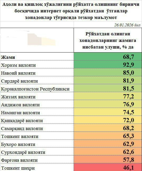 Аҳолини рўйхатга олишнинг ўн биринчи кунида Жиззах вилояти 77,2 фоиз натижани қайд этди.