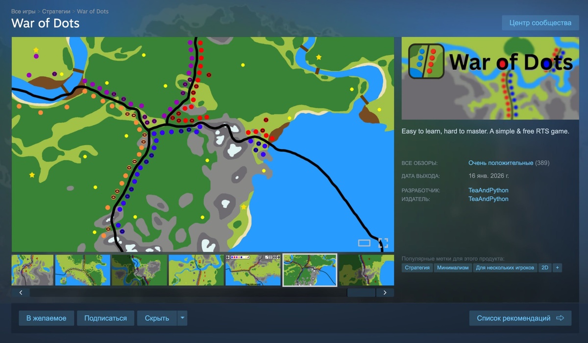 Игроки массово открывают для себя бесплатную War of Dots — стратегию с максимально минималистичным геймплеем. Здесь юниты — это просто разноцветные точки, но по механикам всё как в классических RTS: захват городов, контроль ресурсов и масштабные сражения. Геймеры называют игру настоящим гемом — у неё уже 93% положительных отзывов. Дополнительный плюс: War of Dots запускается даже на калькуляторе, так что попробовать может буквально каждый. 📰 Следите за новостями вместе с нами