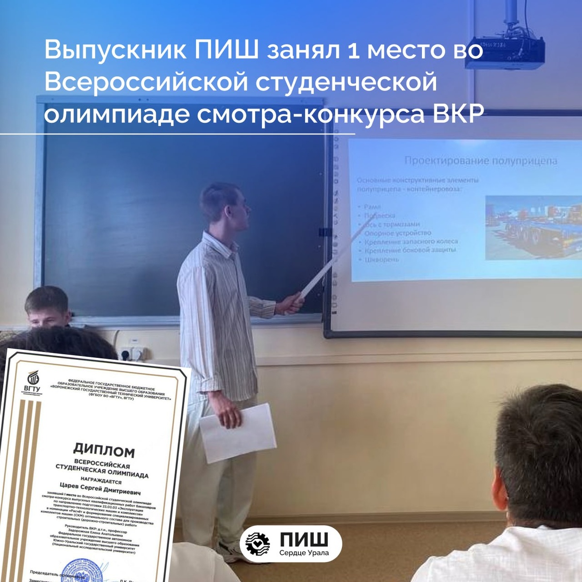 😎😎😎😎😎😎😎 Проект выпускника ПИШ «Сердце Урала» стал лучшим на всероссийском конкурсе 🔥 Выпускник Передовой инженерной школы «Сердце Урала» Сергей Царев завоевал первое место во Всероссийской студенческой олимпиаде — смотре-конкурсе выпускных квалификационных работ бакалавров по направлению «Эксплуатация транспортно-технологических машин и комплексов». 📣 Сергей представил дипломный проект «Разработка полуприцепа-контейнеровоза уменьшенной снаряжённой массы с сохранением прочностных характеристик несущей конструкции» в номинации «Расчёт и формирование специализированных комплектов машин оптимального состава для производства дорожно-строительных работ». Проект позволяет значительно снизить массу транспортной техники без ущерба для её прочности, что особенно актуально для дорожно-строительной отрасли. Разработка выполнена по реальному техническому заданию от ПАО «Уралавтоприцеп» — ведущего производителя специальной техники. 📌 Работу курировала Елена Анатольевна Задорожная — рук