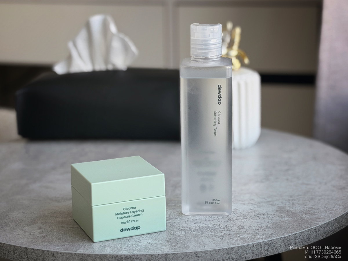 Приветствую вас, мои требовательные красавицы! 🩷 По итогам Интершарма я делилась с вами, что в Россию вот-вот приедет классный корейский бренд dewdap с эффективными составами, направленными на восстановление и увлажнение кожи, и очень необычными формулами. Эта косметика очень популярна в Южной Корее и стала хитом в их локальной сети Olive Young. Я тоже подружилась с большинством средств, так что с удовольствием поделюсь с вами своими честными впечатлениями. У dewdap две больших серии средств: успокаивающая и подтягивающая. Обе кажутся мне универсальными и продуманными, но первая, в зелёных баночках, особенно подойдёт для обезвоженной и чувствительной кожи. Из этой серии я взяла тонер и капсульный крем. Тонер dewdap Cicatea Softening Toner выполняет сразу две задачи: мягко отшелушивает кожу благодаря сочетанию разных видов кислот (AHA, BHA, PHA) и классно снимает красноту. В составе тонера множество успокаивающих и осветляющий компонентов, а вот концентрация кислот совсем небольшая. Та