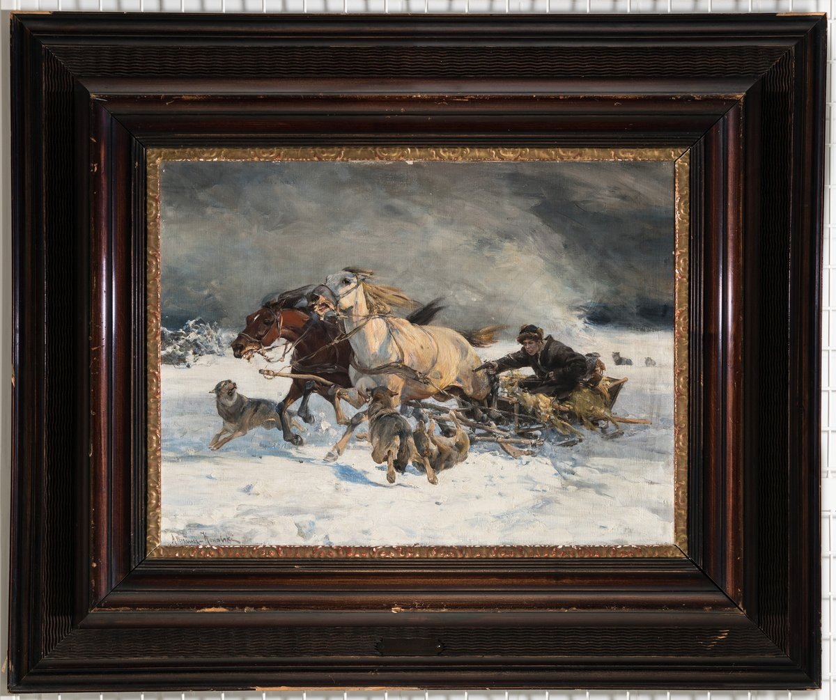 Картина Альфреда Веруш-Ковальского (1849–1915) «Почтовые сани, атакованные волками» была приобретена Музеем изящных искусств Будапешта в 1913 году из собрания графа Денеша Андраши де Чиксенткираля и Краснахорки. Присутствие Ковальского в картинной галерее графа не было случайностью, поскольку он был одним из самых важных польских художников своего времени. Он стал особенно популярен благодаря своим зимним пейзажам родной страны, хотя большую часть жизни прожил в Мюнхене, где одним из его учителей был Шандор Вагнер (1838–1919). Картины Ковальского отличаются динамичными композициями, часто изображающими сцены охоты или верховой езды. Его работы часто воспроизводились на современных открытках. На рассматриваемой картине, сцена изображена с невероятной драматичностью: напряжение в мышцах испуганных скачущих лошадей ощутимо, их языки высунуты изо рта, а возница саней отчаянно пытается прицелиться в волков из ружья. Однако волки — не единственная опасность, поскольку на заднем плане зл