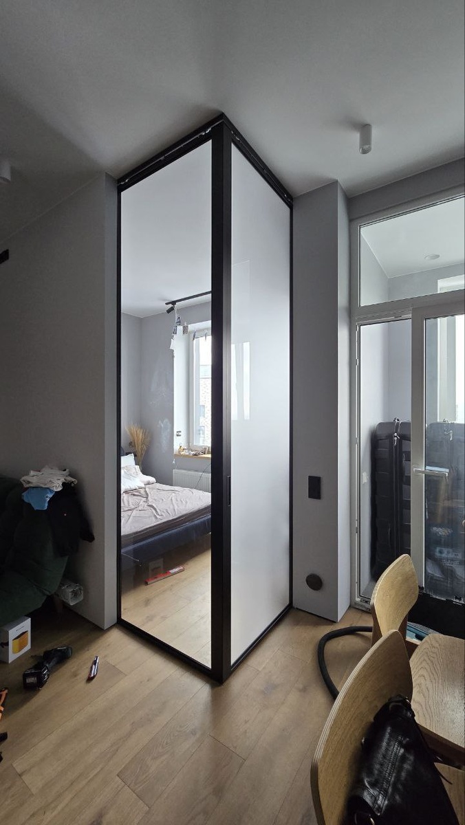 ⛷ Уделили такое особое внимание , так как перегородка угловая, с композицией матового и осветленного стекол💠Интересное решение, когда с одной стороны хочется скрыть видимое,а с другой - лицезреть💡 Любим такие работы, делаем идеально, на радость Вам🤗 На угловой перегородке очень круто видна плавная работа доводчиков, смотрите видео🎥 #раздвижнаяперегородка #перегородканазаказ #лофтперегородка #межкомнатнаяперегородка #перегородкиизстекла #простормебель #лучшиевделе
