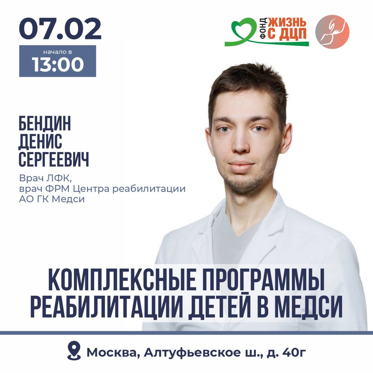 ! 🗓7 февраля 2026 года в 13.00 в помещении БФ "Жизнь с ДЦП" по адресу Алтуфьевское шоссе, 40Г, состоится встреча с врачом ЛФК, врачом ФРМ Центра реабилитации АО ГК Медси, Бендиным Денисом Сергеевичем. 📄Доктор выступит с докладом "Комплексные программы реабилитации детей в МЕДСИ". На встрече вы узнаете: ✅какие показания для прохождения кура реабилитации в АО ГК Медси; ✅какие процедуры и занятия входят в курс реабилитации; ✅какие методики применяются; ✅какие условия проживания в клинике; ✅какие условия прохождения реабилитации в дневном стационаре; ✅какие варианты оплаты реабилитации существуют; ✅как записаться на курс. Количество мест ограничено. 💻Для участия в мероприятии необходима регистрация. Записаться и задать вопросы можно, перейдя по ссылке