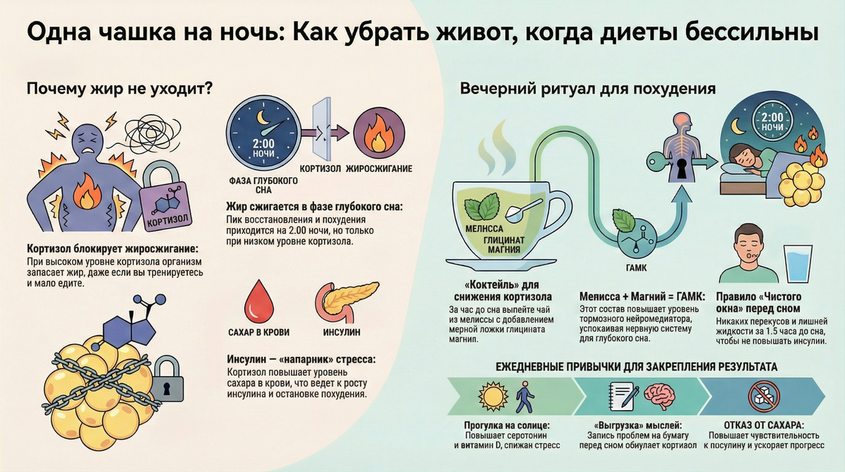 Как убрать живот, когда диеты бессильны? Если вы соблюдаете низкоуглеводную диету, изнуряете себя тренировками, но ваша талия никак не уменьшается, эта информация для вас. Многие делают упор на снижение калорий, но иногда это просто не работает. Почему? Потому что в игру вступают гормоны. У нас есть семь гормонов, сжигающих жир, но есть два «хулигана», которые им противодействуют: кортизол и инсулин. Если эти двое активны, жиросжигание отключается полностью, так как они гораздо мощнее. Особенно коварен кортизол. Мы привыкли считать его гормоном стресса, но это еще и мощный жирозапасающий гормон, который особенно активен ночью. Секрет ночного похудения Знаете ли вы, что жир сжигается не в спортзале, а когда вы спите? Это происходит в фазе глубокого дельта-сна. В норме в 2:00 ночи уровень кортизола должен быть минимальным, чтобы организм мог восстанавливаться и сжигать жировые запасы. Но если кортизол ночью высок, вы не входите в глубокую фазу сна, и все ваши усилия в спортзале обнуляютс
