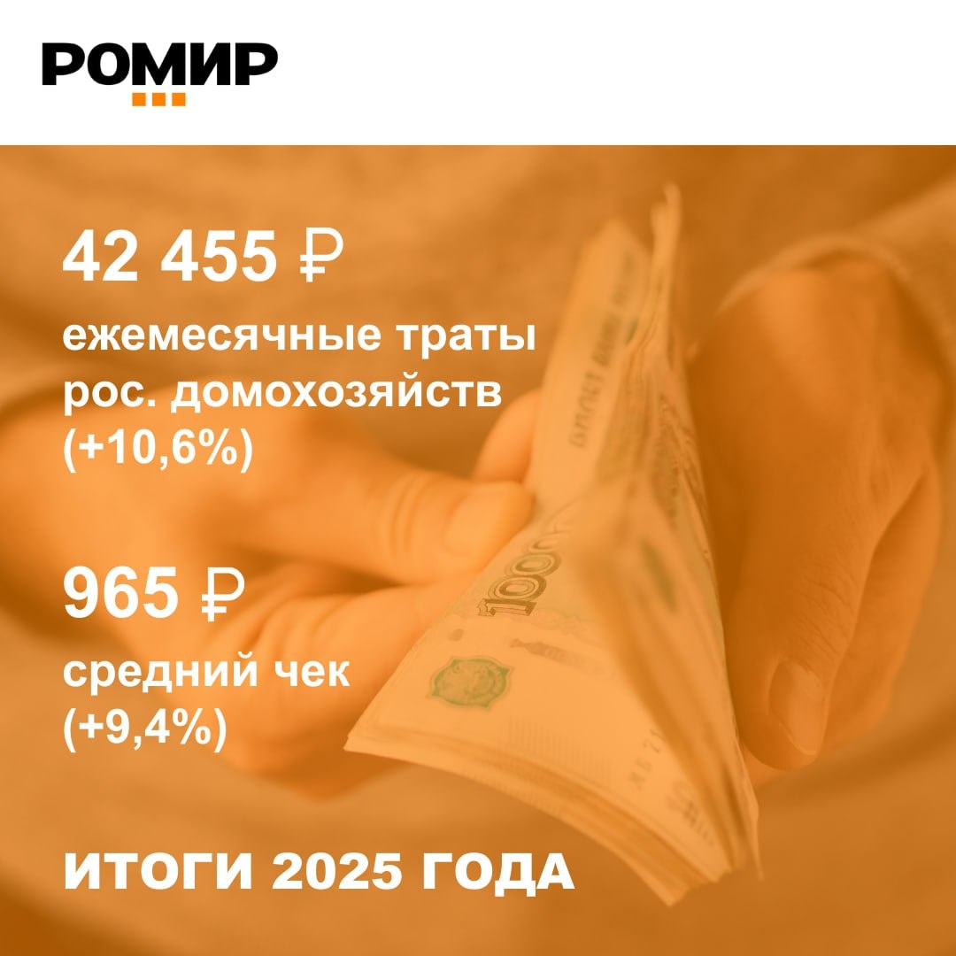 🔸 Ежемесячные траты российских домохозяйств в 2025 году в среднем составили 42 455 руб. (+10,6%, или 4 072 руб., рост год к году). 🔸 Средний чек в 2025 году составил 965 руб. (+9,4%, или 83 руб., рост год к году). «Подводя итоги 2025 года мы видим, что индекс покупательской уверенности хоть и остается в «зеленой зоне», но тем не менее демонстрирует снижение. Безусловно, это находит отражение с точки зрения конкретных мер покупательского поведения. В 2025 году экономия становится новой нормой», – директор по работе с клиентами FMCG и ритейл РОМИР Анастасия Сидорина Таким образом, в 2025 году экономия превратилась в базовую стратегию: потребители ищут оптимальные решения, а рынок адаптируется к этим изменениям. #потребительскоеповедение #индексы #итогигода 👉 Подпишитесь на канал РОМИР: https://dzen.ru/id/5b17e97cdd24847522f9fa94