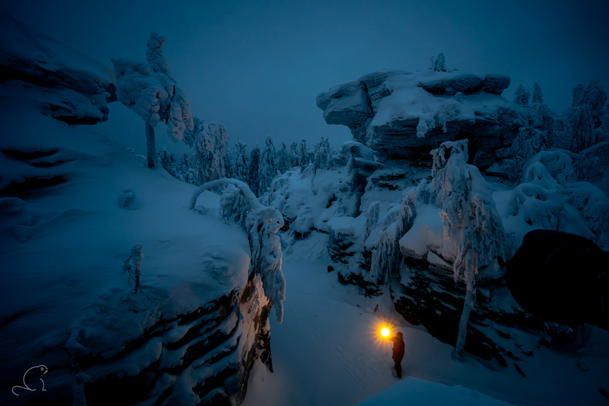 Представьте себе такую картину: ранним зимним утром вы оказываетесь в таинственном месте, которое днем напоминает муравейник, заполненный туристами, снимающими селфи и пытающимися не попасть в кадр друг друга. Ранним утром туман рассеивается, и Каменный Город предстает перед вами совершенно другим обликом — спокойным, величественным и абсолютно свободным от толп любопытствующих глаз. Вы идете по узким тропкам, покрытым пушистым белым ковром снега, словно первооткрыватели неизведанных земель. Под ногами хрустит снежок, эхо шагов разносится далеко вокруг, создавая ощущение полного одиночества и единения с природой. Вы чувствуете себя героями фильма, исследующими затерянный мир, скрытый от посторонних взглядов. И вдруг... открывается потрясающая панорама ночной красоты. Скалы, подсвеченные лунным светом, создают иллюзию сказочного замка, будто бы построенного волшебниками из древних легенд. Вам кажется, что камни шепчут вам секреты веков, раскрывают тайны давно минувших времен. Здесь не