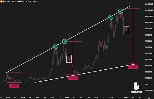 Криптоаналитик Leshka.eth, ссылаясь на долгосрочный технический анализ, прогнозирует падение биткойна на 72,86% до $30 000. Анализ сравнивает текущую динамику биткойна с пиком 2021 года, отмечая повторение схожего паттерна. Это потенциально может означать значительную коррекцию, исходя из взаимодействия биткойна с восходящим многолетним каналом в предыдущих циклах. 📊 Ключевые моменты: - Анализ основан на повторяющихся паттернах поведения цены биткойна на недельном таймфрейме. - Прогнозируемый уровень поддержки: $30 000. - Биткойн уже скорректировался примерно на 30% с момента достижения новых максимумов в октябре 2025 года, торгуясь ниже $90 000. - Прошлые обвалы после пиков составляли около 84,99% (после 2017 года) и 77,47% (после 2021 года).
