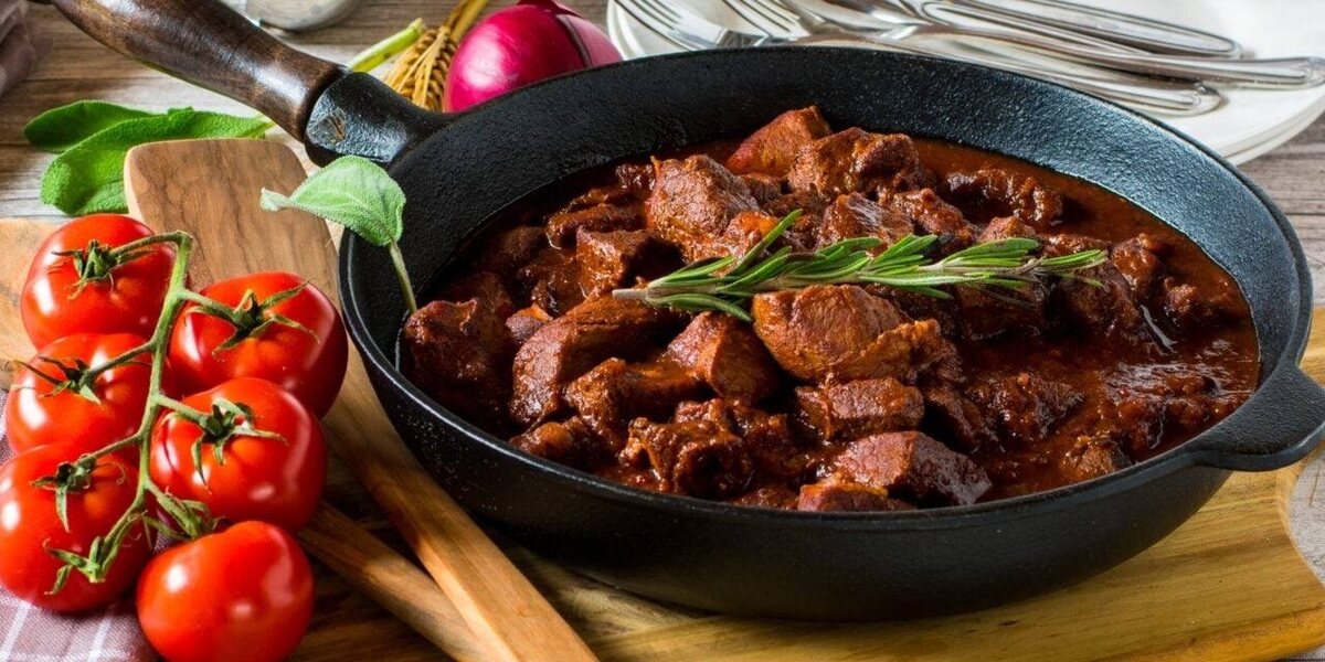 Потушите мясо на сковороде в овощном соусе, и вкус получится очень насыщенным. ИНГРЕДИЕНТЫ: Мякоть свинины 750 г Репчатый лук 1 штука Помидоры в собственном соку 200 г Сельдерей 1 стебель Морковь 1 штука Чеснок 2–3 зубчика Растительное масло 2–3 ст. ложки Томатная паста 1 ч. ложка Сухое красное вино 200 мл Вода 300–350 мл Соль ⅔ ч. ложки Перец чёрный молотый по вкусу Лавровый лист 1 лист Розмарин 1 веточка Мускатный орех 1 щепотка ПРИГОТОВЛЕНИЕ: Мясо нарежьте средними кусочками, а лук, помидоры и сельдерей — мелкими. Морковь натрите на крупной тёрке. Чеснок пропустите через пресс. В сковороде разогрейте масло на среднем огне. Подрумяньте свинину со всех сторон и выложите на тарелку.