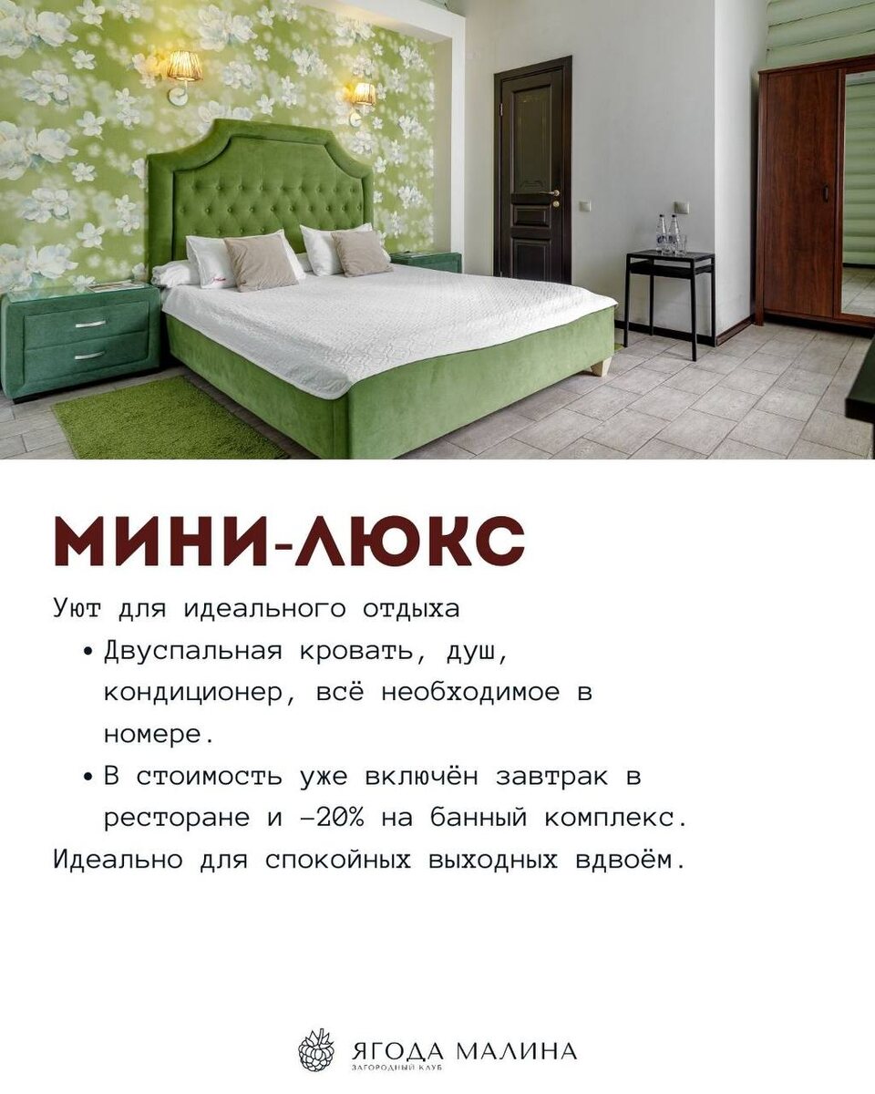? В Загородном клубе «Ягода Малина» мы подготовили несколько вариантов проживания — от уютных номеров до просторных коттеджей для компаний и мероприятий Здесь вы найдёте формат отдыха именно для себя: • романтические выходные вдвоём • семейный уикенд на природе • праздник с друзьями или закрытое мероприятие Во всех вариантах проживания вас ждут комфорт, завтрак в ресторане и приятные бонусы — скидка 20% на банный комплекс Выбирайте свой идеальный номер или коттедж и бронируйте отдых уже сейчас 💚 📲 Подробности и бронирование — в директ / по телефону: +7 (938) 551-00-07