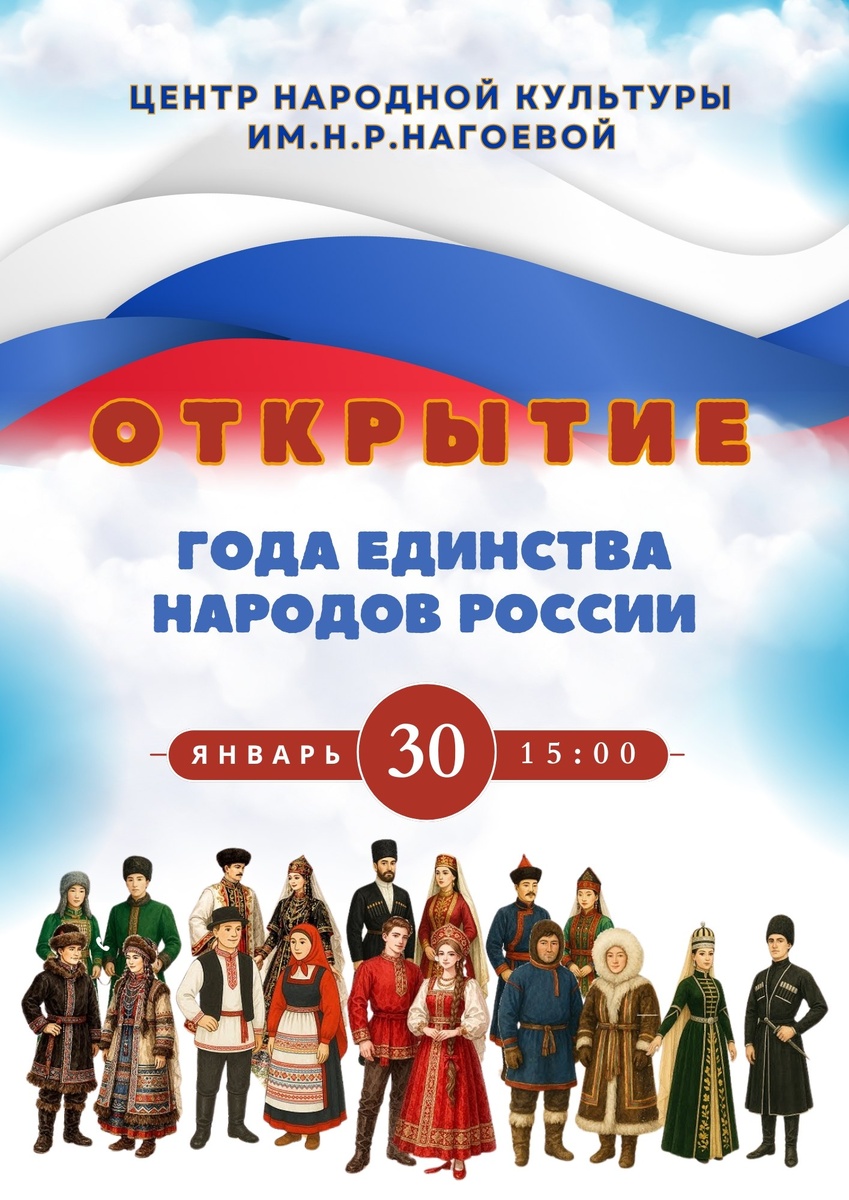 Дорогие друзья! Приглашаем вас принять участие в значимом событии – торжественном открытии Года единства народов России, которое состоится в нашем районе. 🗓️ Дата: 30 января ⏰ Время: 15:00 📍 Место: Центр народной культуры им. Н.Р. Нагоевой