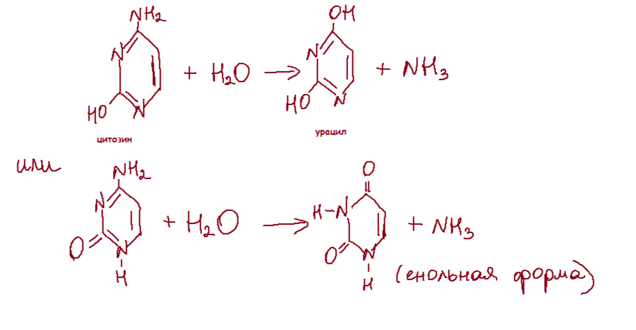 В ДНК каждой клетки человека происходит за сутки около 100 таких событий. Чаще всего дезаминируется цитозин. При дезаминировании любых оснований возникают нехарактерные для ДНК основания. Это позволяет репаративной системе клетки узнавать продукт дезаминирования и удалять его. Можно считать, что именно поэтому ДНК, в отличие от РНК, присутствует тимин, а не урацил: урацил не отличим от продукта спонтанного дезаминирования цитозина.