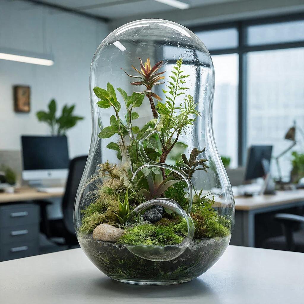 Чтобы правильно разместить флорариум в офисном пространстве, обратите внимание на несколько важных факторов: 1. Освещение Растения нуждаются в достаточном количестве света, однако прямые солнечные лучи могут негативно сказываться на некоторых видах. Разместите флорариум возле окна, ориентированного на восток или запад, либо выберите затенённое окно, если оно выходит на юг. Можно также дополнить искусственным светом, установив светодиодные лампы с мягким спектром. 2. Температура и влажность Большинство растений предпочитают умеренную температуру (+18…+25°C). Флорариум нельзя ставить рядом с отопительными приборами или кондиционерами, чтобы избежать резких колебаний температуры. Высокая влажность важна для многих видов растений, поэтому размещение вблизи увлажнителей воздуха или аквариумов тоже приветствуется. 3. Место отдыха сотрудников Установите флорариум в зоне отдыха или около рабочего стола, чтобы сотрудники могли получать удовольствие от созерцания зелени и цветов. Натуральная з