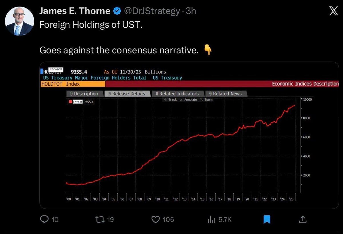 Лгут интерпретации. На скринах — два «противоречивых» факта, которые многие пытаются столкнуть лбами. С одной стороны, иностранные держатели продолжают наращивать объем US Treasuries. Абсолютные значения — на исторических максимумах. Это идет вразрез с популярным нарративом про «мир избавляется от доллара». С другой стороны, доля доллара в мировых валютных резервах действительно падает и находится на минимуме за десятилетия. И это тоже правда. И вот здесь начинается самое интересное. Проблема в том, что большинство смотрит либо только на долю, либо только на абсолют — и делает выводы. Но рынки так не работают. Что происходит на самом деле: Первое. Мировая финансовая система раздулась в разы. Объем резервов вырос, долгов стало больше, ликвидности больше. В такой системе доля доллара может снижаться, даже если спрос на долларовые активы в абсолюте растет. Второе. Центральные банки диверсифицируются — да. В золото, в региональные валюты, частично в альтернативные инструменты. Но к