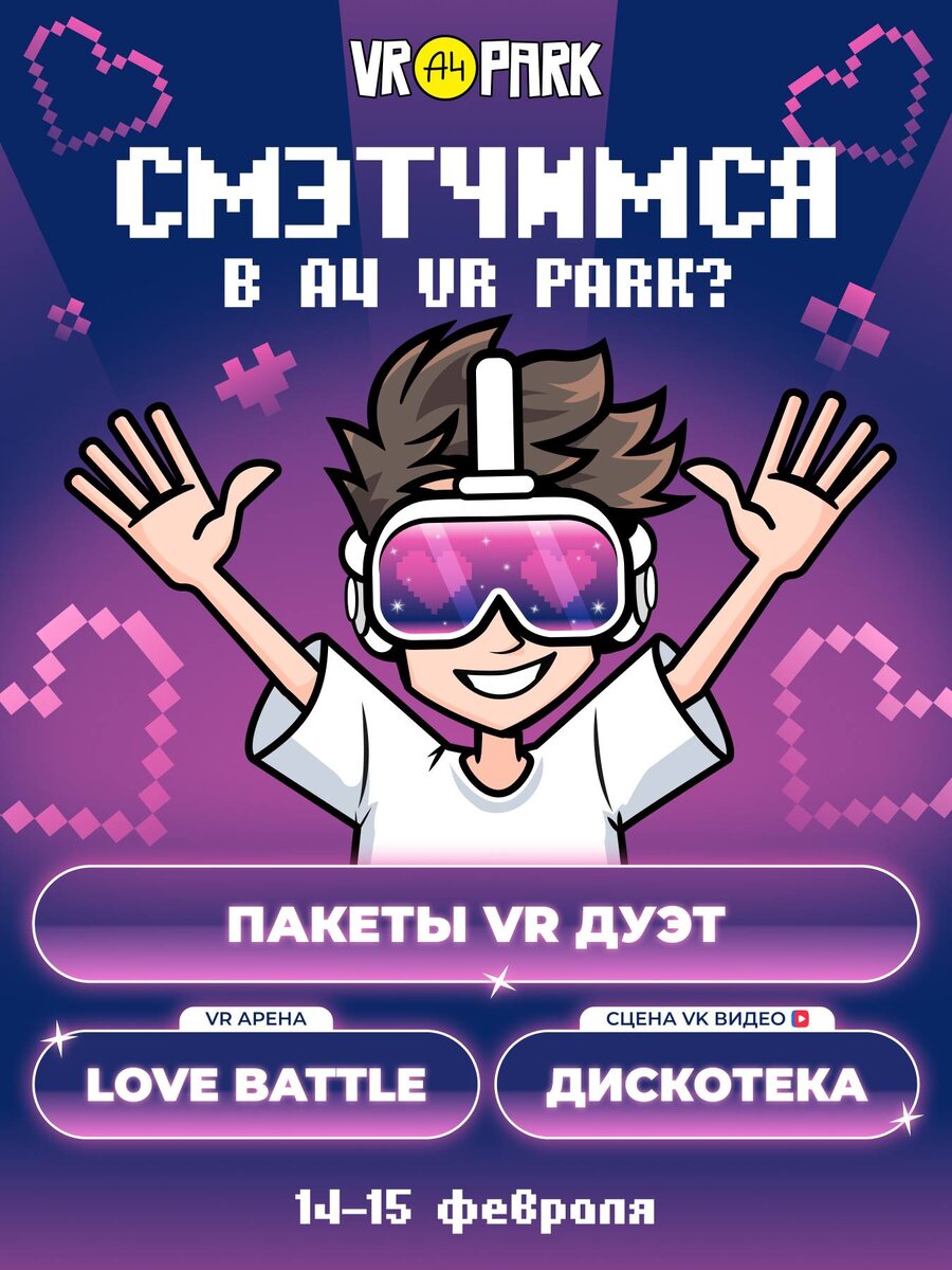 ? 🩷 Здесь свидания выходят на новый уровень — в виртуальной реальности✨ В этот день вас ждёт: 🩷Love-битвы на A4 VR ARENA — общий драйв, эмоции и командный азарт 🩷Дискотека — музыка, свет и атмосфера праздника 🩷Пакеты «VR-Дуэт» — игра вдвоём на VR-арене (пн-чт) Пакет 1: 30 минут арены + 6 игр + «Run & Tag» = 5 000₽ Пакет 2: 30 минут арены + 6 игр = 4 500₽ Пакет 3: 30 минут арены + 10 игр = 5 000₽ Пакет 4: 60 минут арены + 6 игр = 5 800₽ Пакет 5: 60 минут арены + 4 игры = 5 300₽ Пакет 6: 60 минут арены + 10 игр = 6 300₽ Проведите этот день ярко, нестандартно и по-настоящему вместе🔥