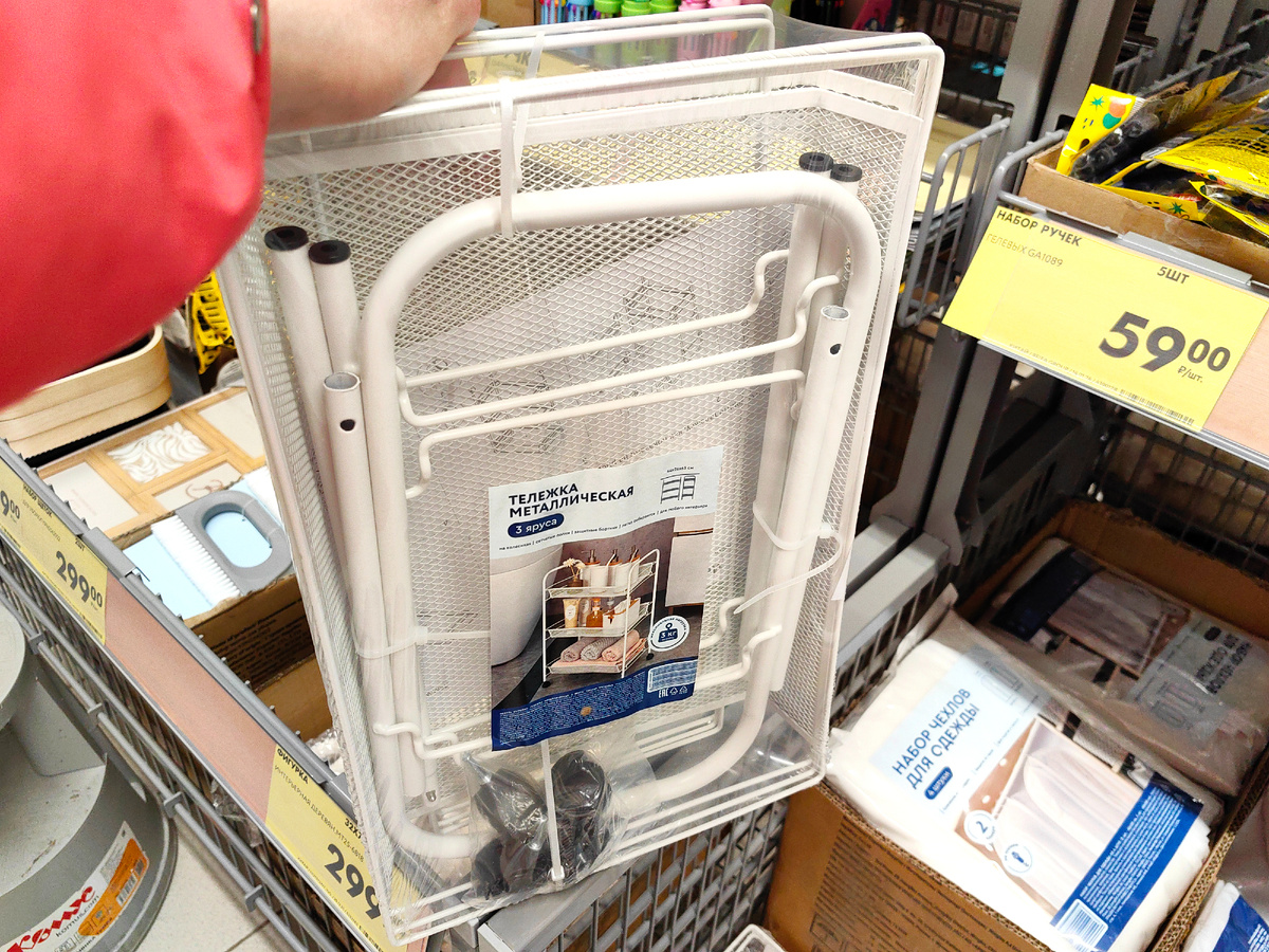 Перед покупкой замерьте место, где планируете ставить. По высоте тележка 63 см, длина 44 см, глубина 26 см. За 999р.