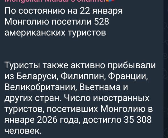 ? Сейчас поясним. Берём, скажем, тему про число иностранных туристов, посещающих Монголию. И сразу у них сенсация, казалось бы: приехало целых 500 американских туристов, небывалый успех отрасли, небывалый интерес граждан США к Монголии, поём и пляшем! Но всё меняется, когда узнаёшь, что из общего числа посещающих Монголию зарубежных туристов примерно по 30 процентов составляют потоки из России и Китая, около 10% южных корейцев, а уже остатки приходятся на гостей из прочих стран, вроде США, Европы и так далее... Главное -- ни одного доброго слова о России! А если в какой-то теме потенциал России невозможно оспорить, то о нём просто молчат, как будто такой страны и нет в мире. 🇲🇳 Планета Монголия. Обсудить пост вы можете в 🇲🇳 Монгольском чате