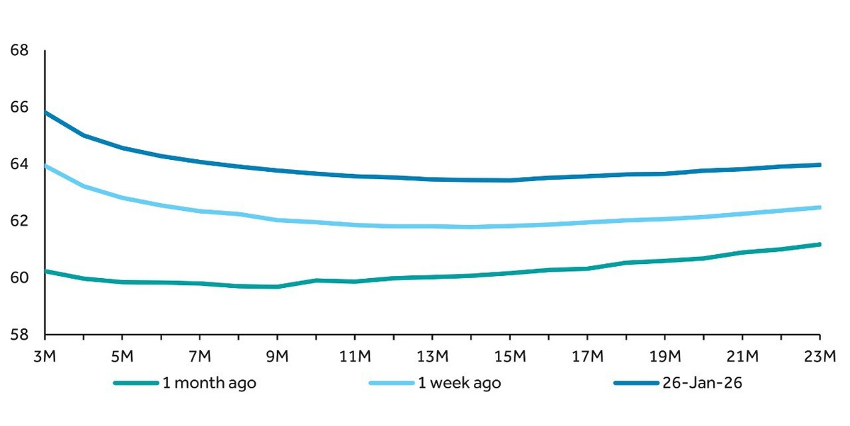 базового спроса. Кривая в бэквордации указывает на то, что текущие баррели торгуются с премией к будущим поставкам, то есть покупатели ценят нефть сегодня больше, чем когда она находится на хранении. Обычно это отражает напряжённую ситуацию на физическом рынке, а не опасения по поводу избыточного предложения, которых некоторые могут опасаться. На рынке с избыточным предложением кривая, скорее всего, будет в контанго. Примечательно, что цены на спотовые фьючерсы сейчас выше уровней, зафиксированных неделю и месяц назад. Этот сдвиг кривой вверх говорит о том, что рынок пересмотрел свои ожидания в отношении будущих цен в сторону повышения, что соответствует улучшению настроений или более сильным, чем ожидалось, фундаментальным показателям. В совокупности это указывает на то, что рынок более здоров и устойчив, чем можно было бы предположить, исходя из некоторых опасений.