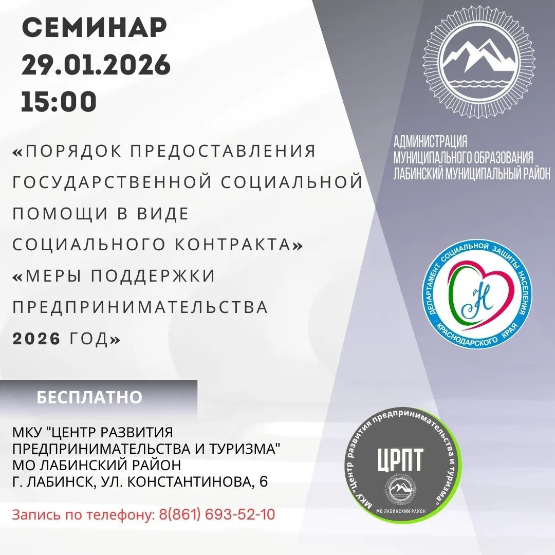 ! В настоящий момент на территории Лабинского района существует возможность заключения социального контракта для открытия собственного дела. 🚨29 января в 15-00 в МКУ «Центр развития предпринимательства и туризма» МО Лабинский район совместно со специалистами государственного казенного учреждения Краснодарского края "Управление социальной защиты населения" в Лабинском районе будет проведен бесплатный семинар по порядку предоставления государственной социальной помощи в виде социального контракта. 📍Семинар будет проводиться по адресу: г. Лабинск, ул. Константинова, 6. ‼️⚠️Запись на семинар по тел. 8(86169)3-52-10