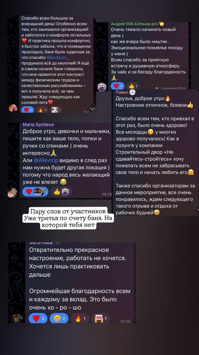 Все 3 йога бани я слышу одно: Али - спасибо это было очень круто. Али- спасибо я очень расслабился и перезагрузился. Али - я бронирую след йога баню. Мне кайфово когда кайфово другим людям. Каждый раз когда ты смотришь и думаешь - это не для меня. Ты сильно ошибаешься,чтобы понять - нужно почувствовать.