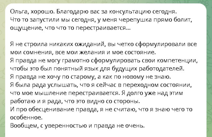 : «Я впервые не хочу по-старому» Делюсь с вами отзывом Елены после наших первых сессий. Елена обратилась ко мне с просьбой «помочь составить резюме под несколько вакансий». Но, уже на первой встрече стало ясно: 👉 проблема совсем не в резюме. Вот что мне написала Елена: "Ольга, спасибо вам за сегодняшнюю консультацию. Что-то мы сегодня запустили, у меня прямо голова болит, ощущение, что что-то перестраивается... Я не строила никаких ожиданий, вы чётко сформулировали все мои сомнения, все мои желания и моё состояние. Я правда не могу грамотно сформулировать свои компетенции, чтобы это был понятный язык для будущих работодателей. Я правда не хочу по-старому, а как по-новому - не знаю. Я была рада услышать, что сейчас нахожусь в переходном состоянии, что моё мышление перестраивается. Я уже давно работаю над этим и рада, что это видно со стороны. И насчёт обесценивания - я не считаю, что знаю что-то особенное. В общем, с уверенностью у меня не очень". Что происходит? Елена столкнулась