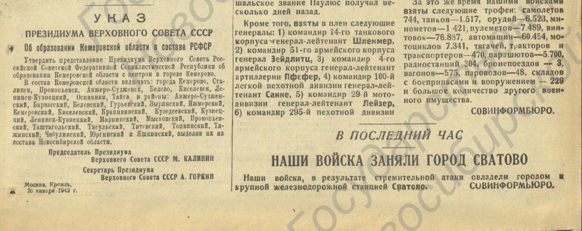 в № 9 от 3 февраля 1943 года, на первой полосе. Центром стал город Кемерово, в состав также вошли Сталинск, ныне Новокузнецк, Прокопьевск, Анжеро-Судженск, Белово, Киселевск, Ленинск-Кузнецкий, Осинники, Тайга и многие районы, которые выделили из состава Новосибирской области.