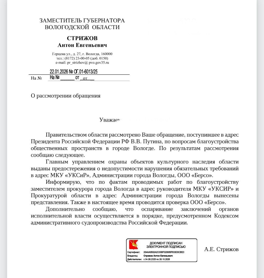 Поводом послужило коллективное обращение градозащитников, направленное на федеральный уровень. По итогам разбирательства областное управление по охране объектов культурного наследия предупредило городские структуры и подрядчика о недопустимости нарушений при проведении работ. Соответствующие уведомления получили муниципальное учреждение, администрация Вологды и компания, выполняющая благоустройство. Главным управлением охраны объектов культурного наследия области выданы предостережения о недопустимости нарушения обязательных требований в адрес МКУ «УКСиР», Администрации города Вологды, ООО «Берсо». Информирую, что по фактам проводимых работ по благоустройству заместителем прокурора города Вологда в адрес руководителя МКУ «УКСиР» и Прокуратурой области в адрес Администрации города Вологды вынесены представления. Также в настоящее время проводится проверка ООО «Берсо». Фото и видео: Настоящая Вологда. 📱 Telegram🐚📱 ВКонтакте🐚💙 Rutube 🐚 📱 Одноклассники