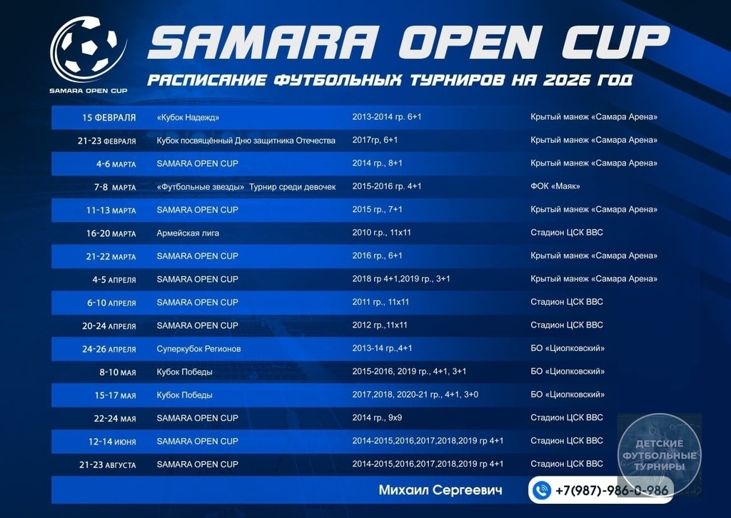 ! Мы рады сообщить, что опубликован долгожданный календарь соревнований на первую половину 2026 года! 🗓️ В представленном расписании указаны точные даты, места проведения и категория каждого турнира, запланированного на этот период. Мы постарались создать сбалансированный график, чтобы у всех участников была возможность оптимально подготовиться и принять участие в интересующих их мероприятиях. 🏆🎉 ❗ Просим обратить внимание, что календарь может быть дополнен или скорректирован в случае возникновения организационных изменений. Любые обновления будут оперативно размещаться на нашем официальном сайте и мессенджере Телеграмм https://t.me/samara_cup. 📞 Запись команд осуществляется по контактному номеру: Михаил Сергеевич +7 (987) 986-09-86 До скорой встречи на соревнованиях! 🏆 --- #ФутбольныйТурнирФевраль2026 #ФутбольныйТурнирМарт2026 #ФутбольныйТурнирАпрель2026 #ФутбольныйТурнирМай2026 #ФутбольныйТурнирИюнь2026 #ФутбольныйТурнирАвгуст2026 #ФутбольныйТурнирЦентральнаяРоссия2026 #Фут
