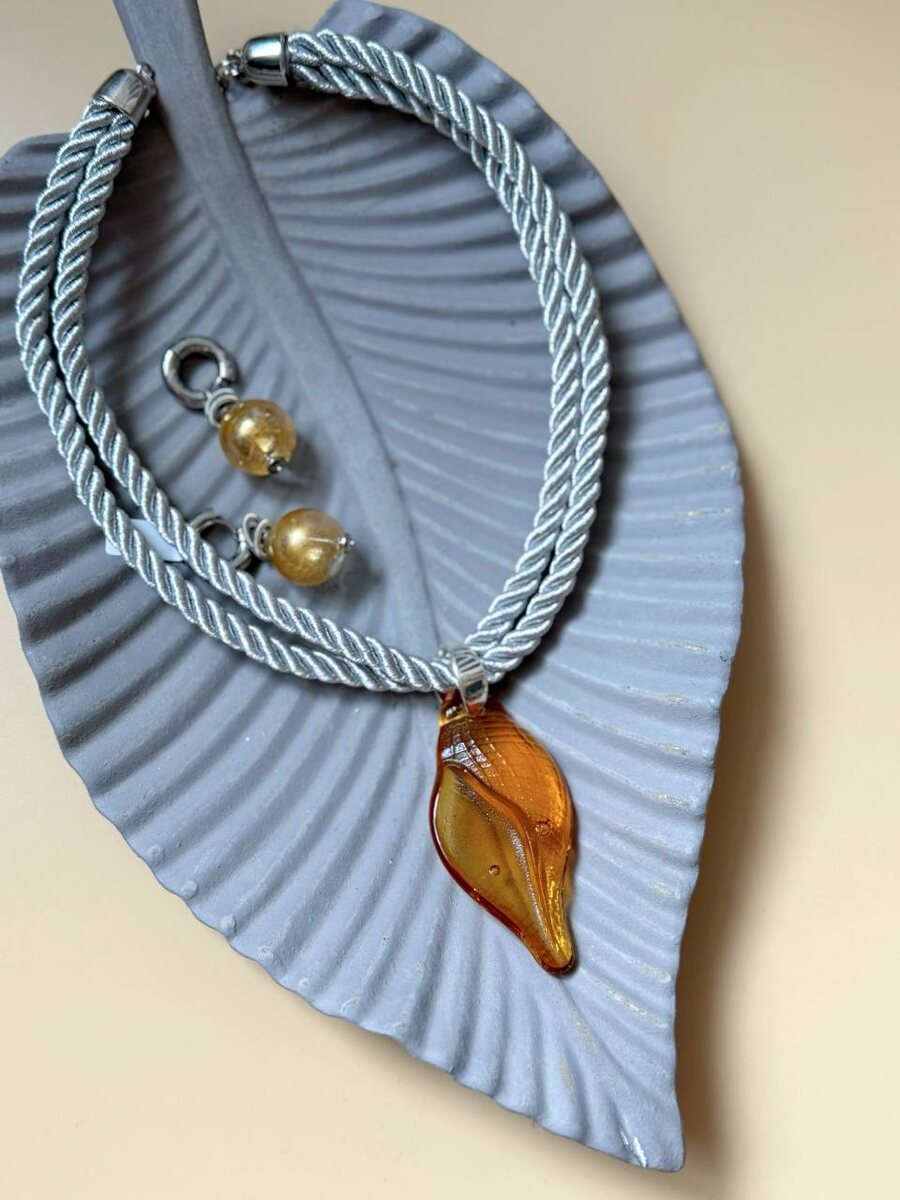 🍃 Плавные линии кулона и благородное сияние золотистых серег создают утонченный образ, наполненный теплом и светом. Уникальный рисунок внутри стекла невозможно повторить, что делает это колье по-настоящему эксклюзивным. Элегантное сочетание медового оттенка с серебристым шнуром подчеркивает ваш изысканный вкус и добавляет наряду аристократичности.🌟 Колье 5700 Серьги 7200 ✨Нажмите для заказа ✉️ Нажмите чтобы задать вопрос