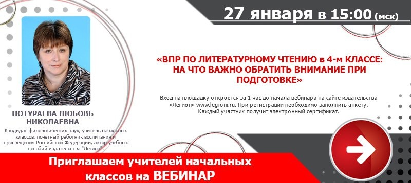 " Дата: 27.01.2026 (Вт) Время: 15:30 Лектор Потураева Любовь Николаевна - кандидат филологических наук, учитель начальных классов, почётный работник воспитания и просвещения Российской Федерации, автор учебных пособий издательства "Легион". Участие бесплатное. Выдается сертификат. Требуется регистрация на сайте издательства