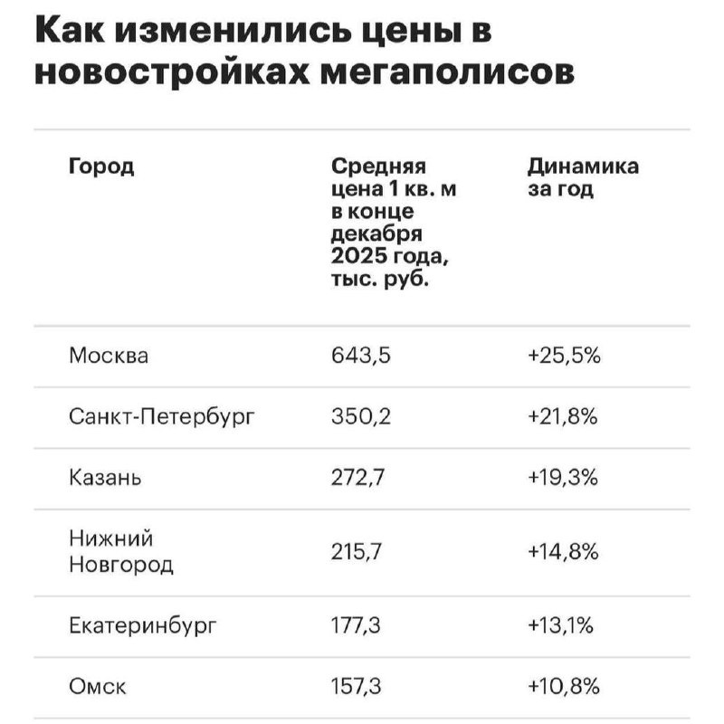Столичные новостройки подорожали на 25,5%. Второе место в рейтинге занял Петербург: средняя цена квадратного метра выросла на 21,8% и достигла 350,2 тыс. руб. Третью строчку с ростом на 19,3% заняла Казань. Падения стоимости жилья нет ни в одном регионе. 😢 — больно на это смотреть 🗿 — все закономерно, ведь зарплаты тоже растут ⭕️ Подписаться | Мы в MAX | Буст